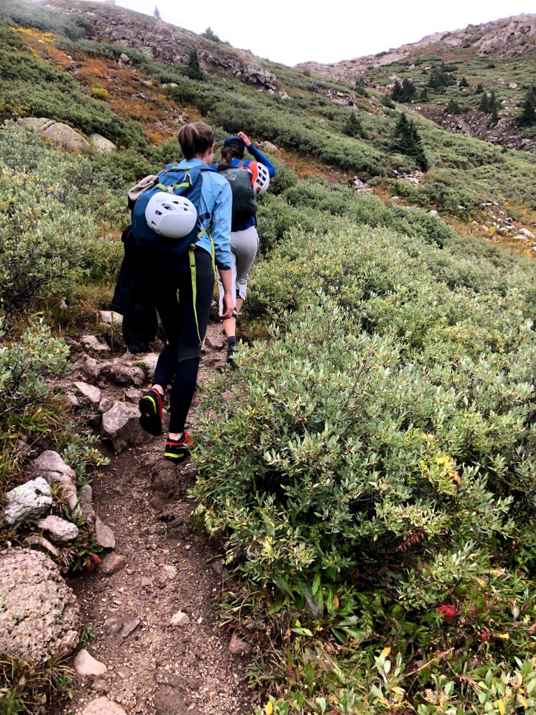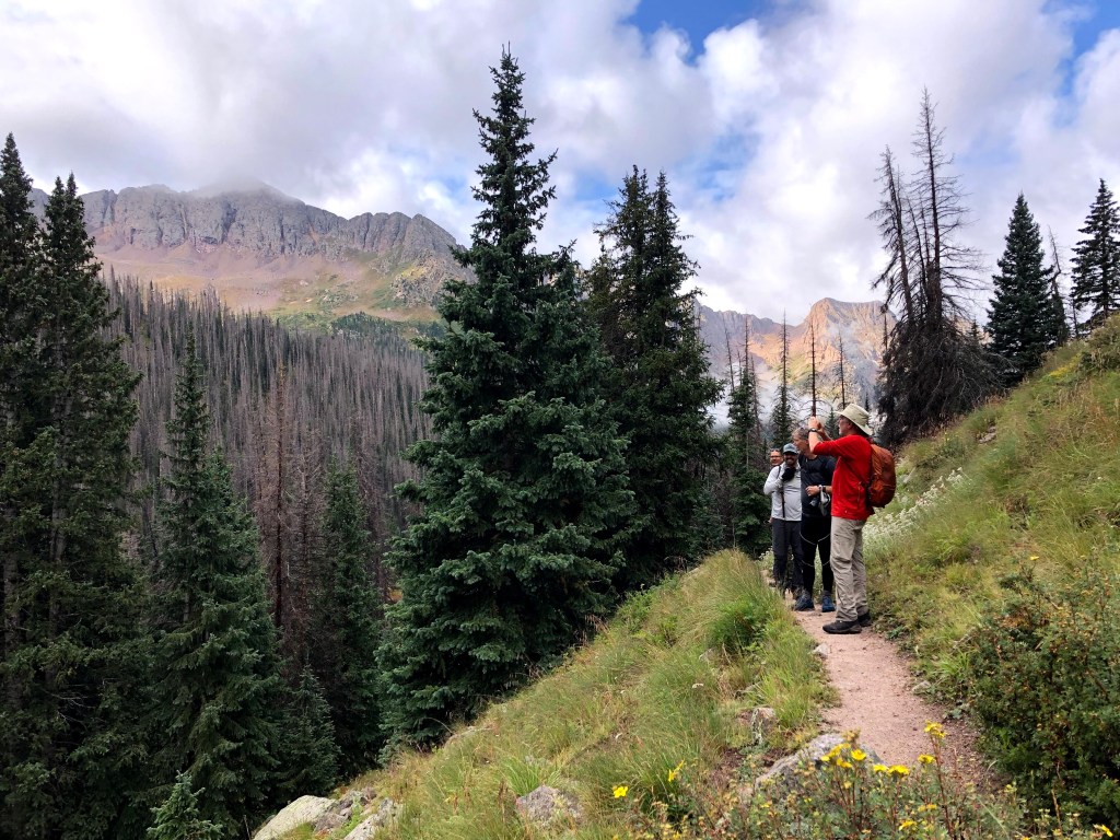 We waited at the branch for everyone to gather, so that no one missed the branch, and our assault on Mt Wyndom commenced. The assault begins with an immediate gain of elevation that almost never really let’s up all that much. Looking back, there were few flat places in the entire ascent. The only places to stop and grab one’s breath were in the switchback corners. It was in one of these corners where I spotted two young males behind us. At every juncture, they closed a lot more distance than I covered between observations, and soon they walked past me on their way to at least a two peak day. I also espied two young females that were also knocking out a decent pace, over-taking my team members one-by-one until they passed me as well. Two sisters, from where I cannot now recall, but their goals for the day included Sunlight and then Wyndom. I was able to keep up with them for a short while, and we talked about the day ahead and how their trip was going. They were here for all four peaks. They educated me that technically because the two Eolus peaks were so close to each other, they only count as 1 14er. That doesn’t stop people from climbing both. When they had tired of an old man following them, they added a little extra to their efforts and soon I was one and then two switchbacks trailing.