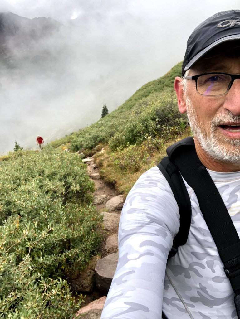 Kevin was my shadow on most of this climb, never more than a switchback behind me. Dan was often next in the queue with Paul and Jim bringing up the rear. I never got too far ahead that we couldn’t always see the entire team covering more than a couple of switchbacks, and I took frequent (as in needed) breaks. Hike at your own pace is how we go. Rest when you need rest.