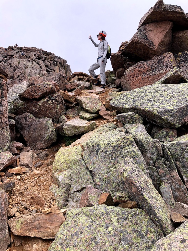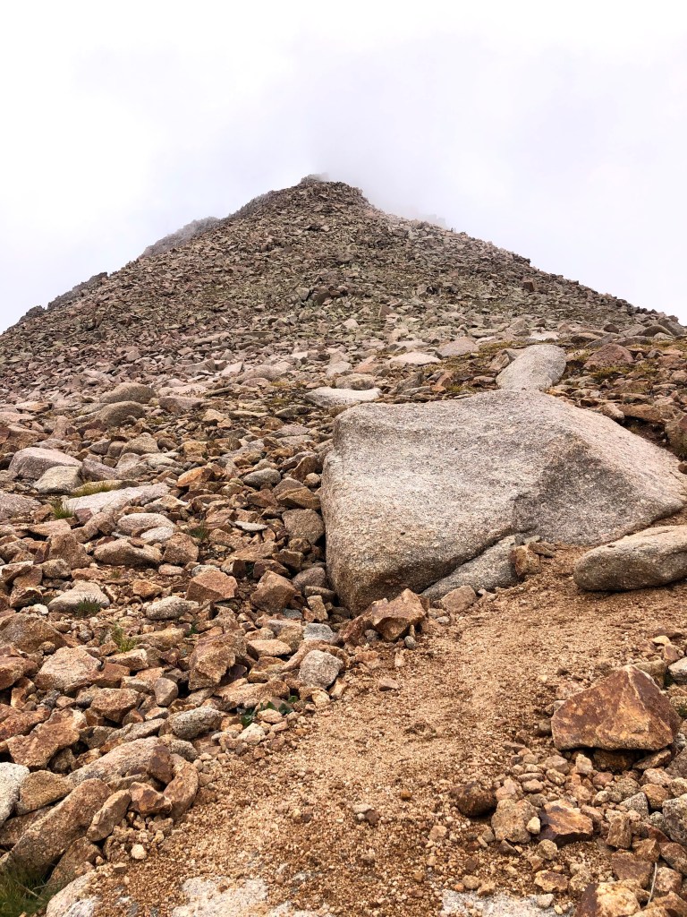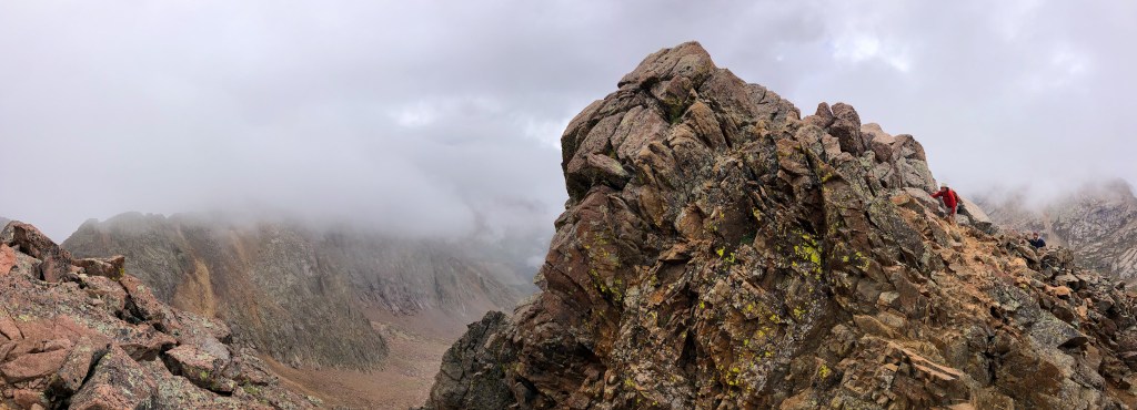 Kevin and I got there first, followed by Jim and Dan, and Paul was a little further back when it began to look like the clouds were gathering more and more, and with the breeze, we couldn’t wait for Paul. We gave him some direction where the cairns were, and afterwards we started up the spine. There was a long ascent on the spine, and then the trail edged around to the North side of a false summit where we hit a sunny shelf. Again, it was me, Kevin, Dan, and Jim. Kevin and I reached the shelf first, and Kevin sat down. I didn’t think that was a good idea, but we were at around 13,800′ and the longer Kevin sat there, the less likely I thought it would be that he would keep going. Dan arrived next and stood next to me, and then Jim, seeing Kevin sitting, sat himself. The two of them looked at each other and decided they had climbed far enough. Dan and I looked at each other and continued on for the final push. We actually had to drop off the shelf into a tight saddle and then climb around the South side and up to the summit which we reached around 1:30 in the afternoon. There were three young men there when we got there, and Dan and I managed to find purchase on a few rocks to sit and enjoy the view, when the view came into focus. More clouds are rolled in, and while we weren’t in clouds, our view of the basin was obscured more than a few times. We sat up there for about 10 minutes shooting the breeze with the other summiteers, and then we all decided it was time to get down.