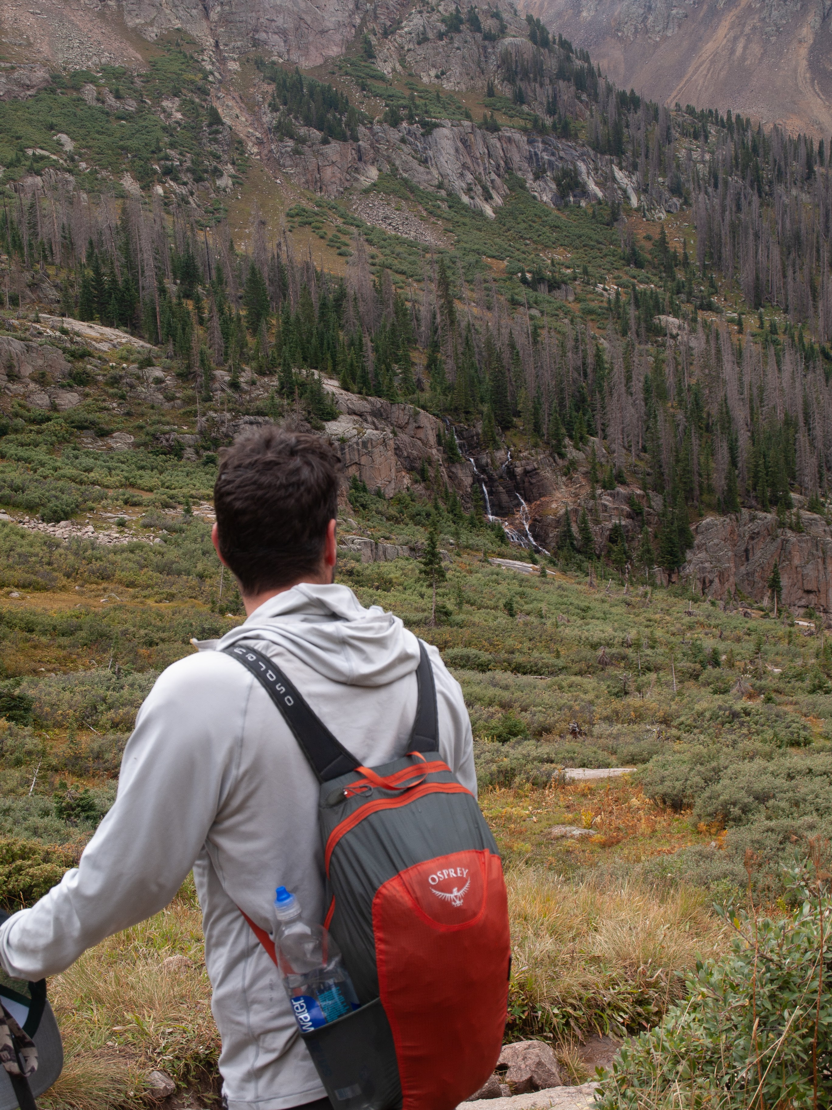 The hike down to the branch point offered no short-cuts across the grade. The main obstacle was a series of rocky cascades that drained the Twin-Lakes, and the other was that no-one had a cut a trail, so down we hiked, past yet another old abandoned mine which did provide a beautiful unobstructed view of the basin, followed by the only water crossing in the entire trip that didn’t look so easy to navigate and offered up the most likely wet foot opportunity to date. I think, but I am not sure, that one of our party continued our ascent with one wet foot.