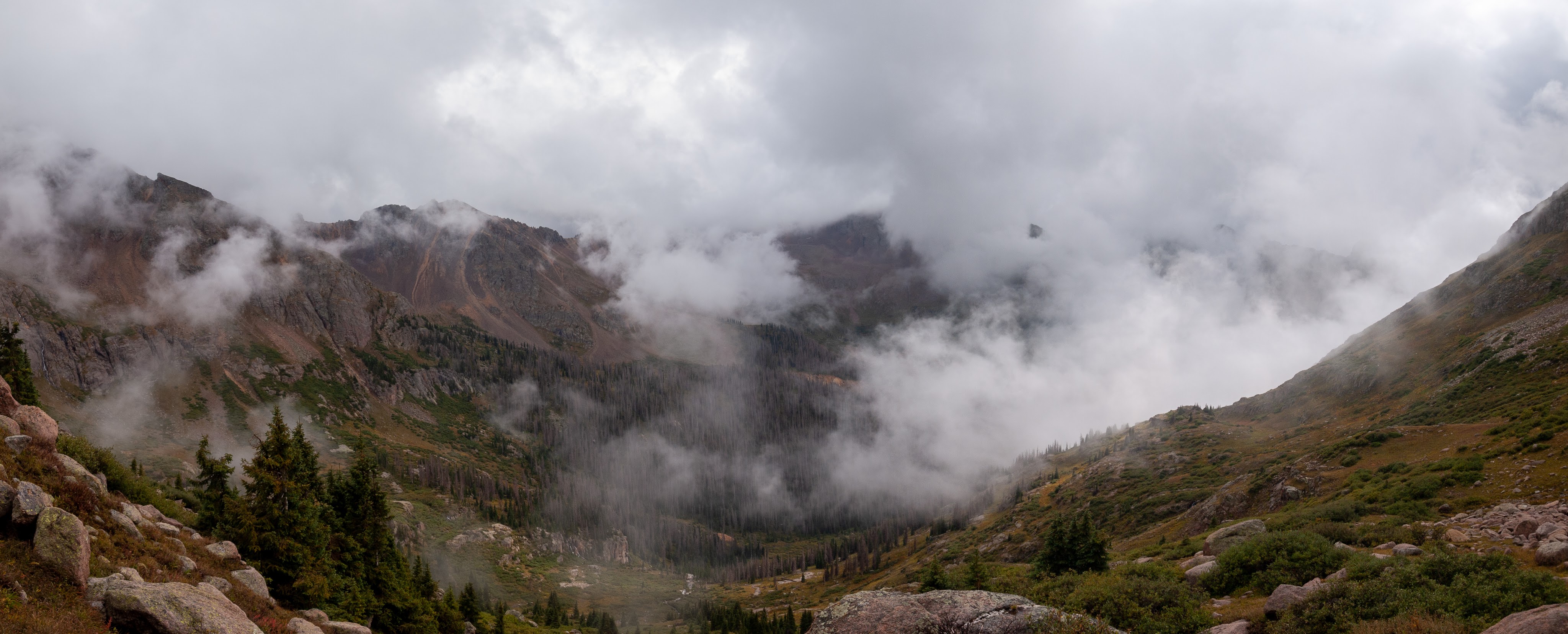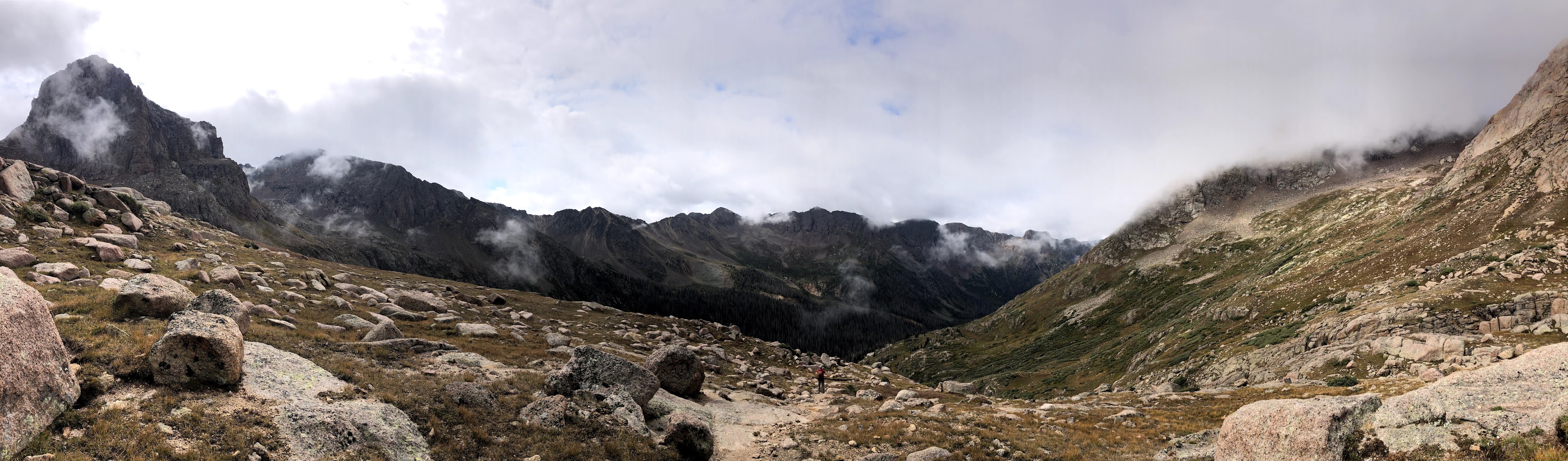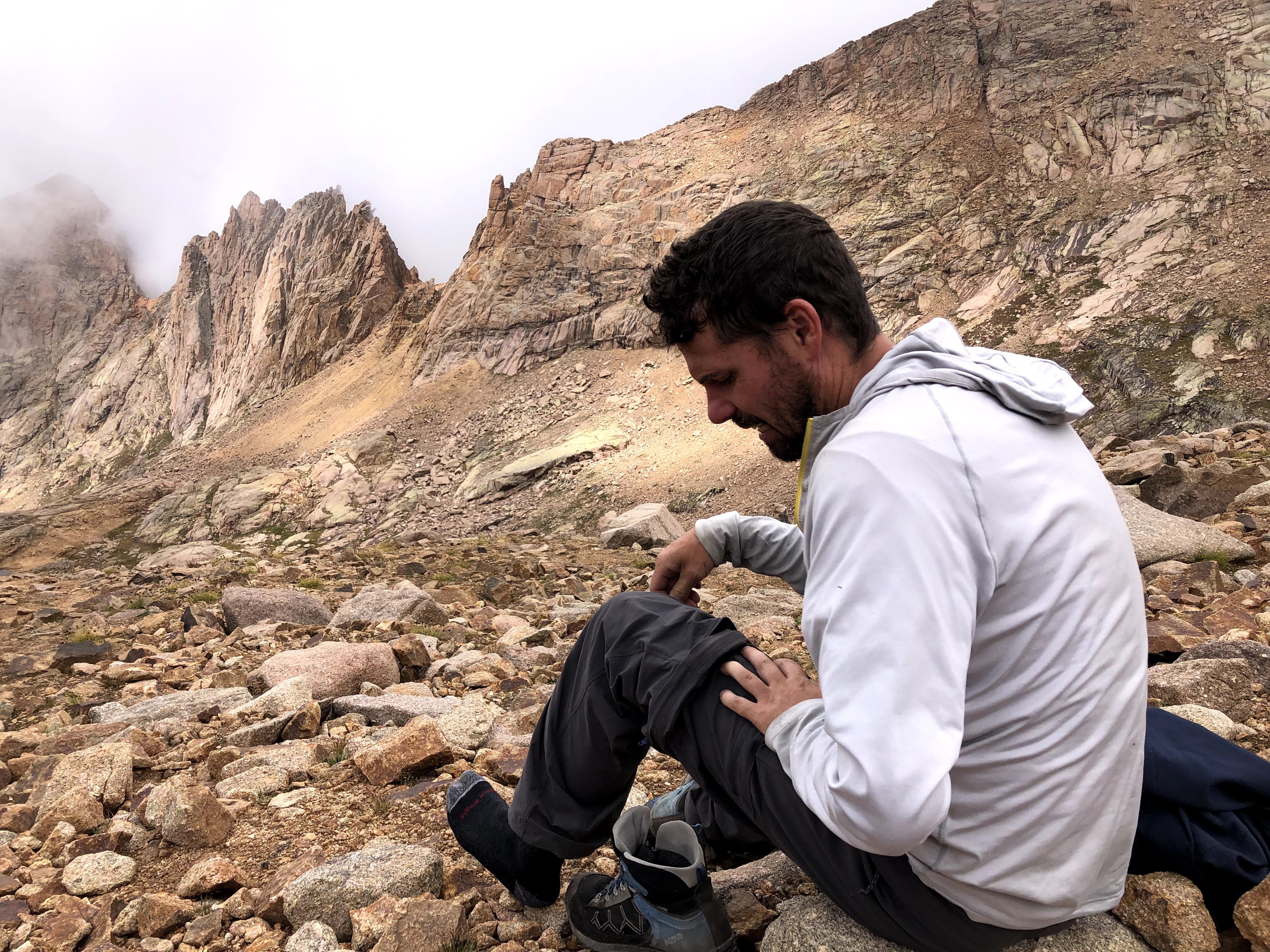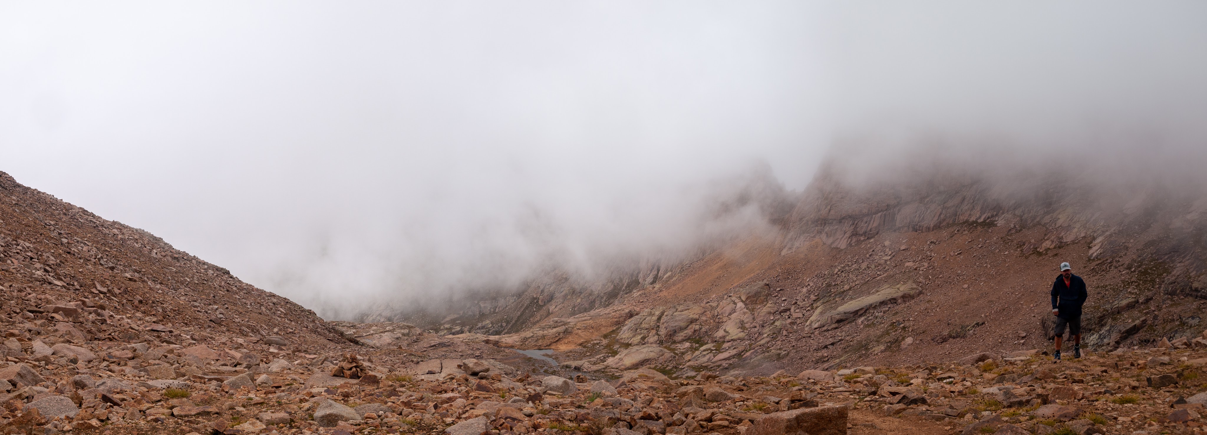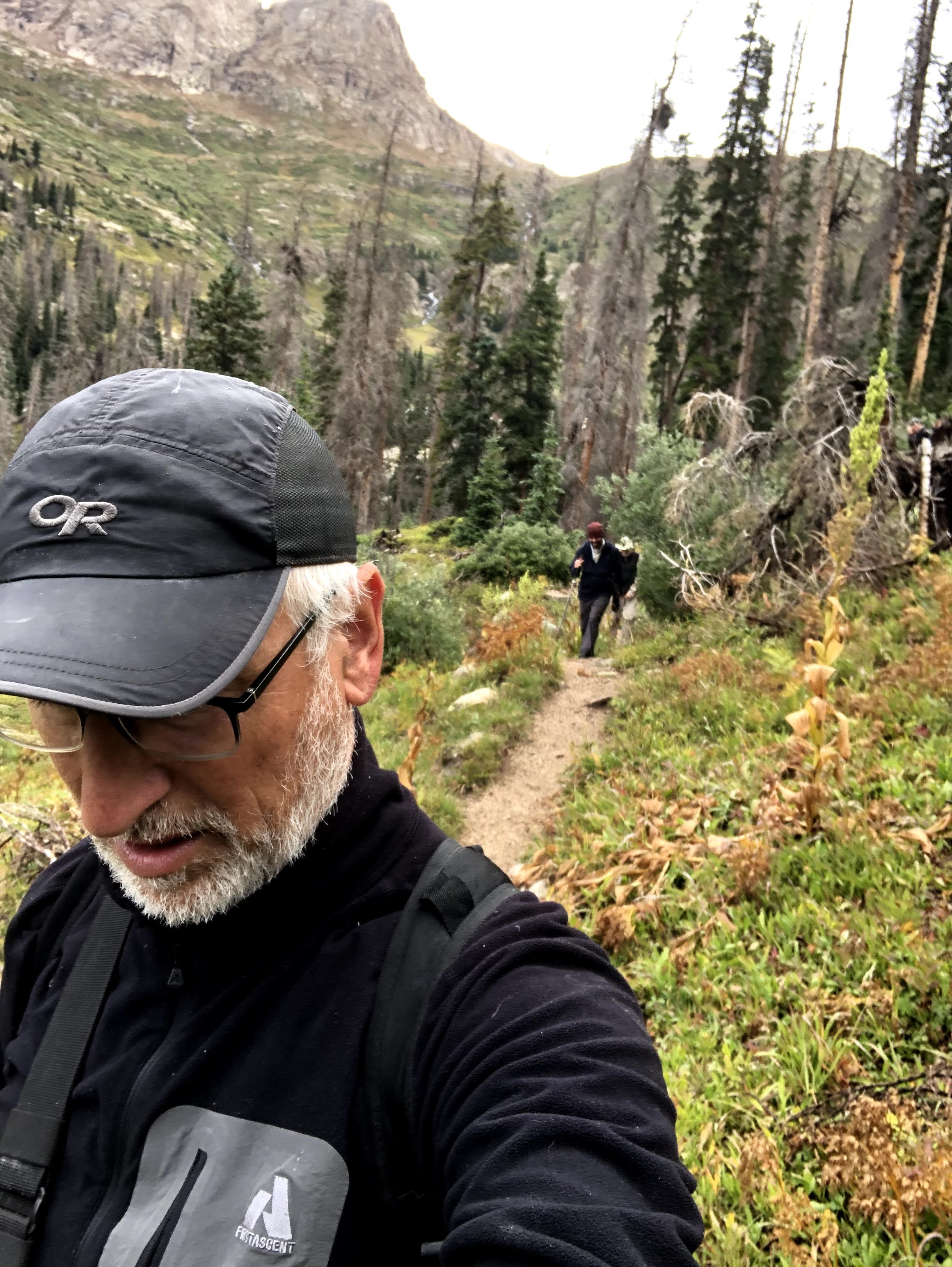 It was on the way down when we ran into Paul who was on his way up. He had not given in to the temptation to stop, and left Jim and Kevin, who he said had already started their descent. At this point I was in down mode, and should have turned around and accompanied Paul back to the top. I could also have advised him to turn around as the weather appeared to be turning and we were going to get some rain at the very least. However, I didn’t say anything of the sort, and wished him luck. I did tell him truthfully that he was almost there, and Dan and I continued down. Back at the tiny saddle it was Dan that remembered we had to climb up and out on the Northwest side of the saddle. I had taken a look on the South side and though it did look passable, I deemed it just a little too risky and followed Dan. Dan was correct. Soon we were rock to rocking it down the cairns and before long we were back at the big saddle. As we sat there, we could see a cloud rolling up and into the basin between Sunlight and Wyndom, and we just knew that cloud was bringing some weather with it. However, I wasn’t going to leave the saddle until I saw Paul coming down, and so we sat, and we sat, and we donned our warmer layer, and we put on our shell, and then the rain started to fall. At one point, still with no sign of Paul, we could no longer even see the top and just hoped that it would clear again. It was actually sleeting a bit as well. Fortunately for us the ground was warmer than freezing, so we didn’t have ice to contend with.