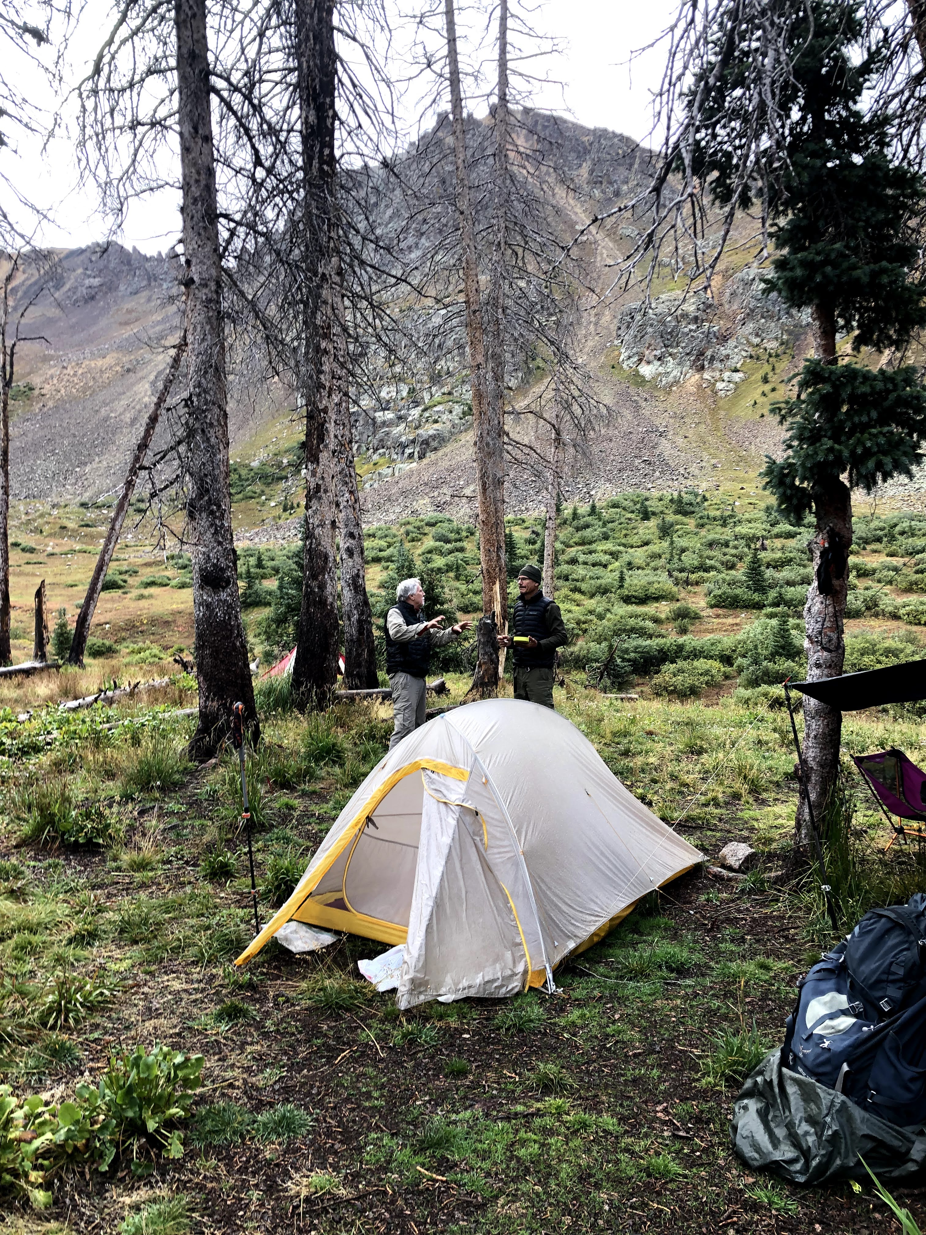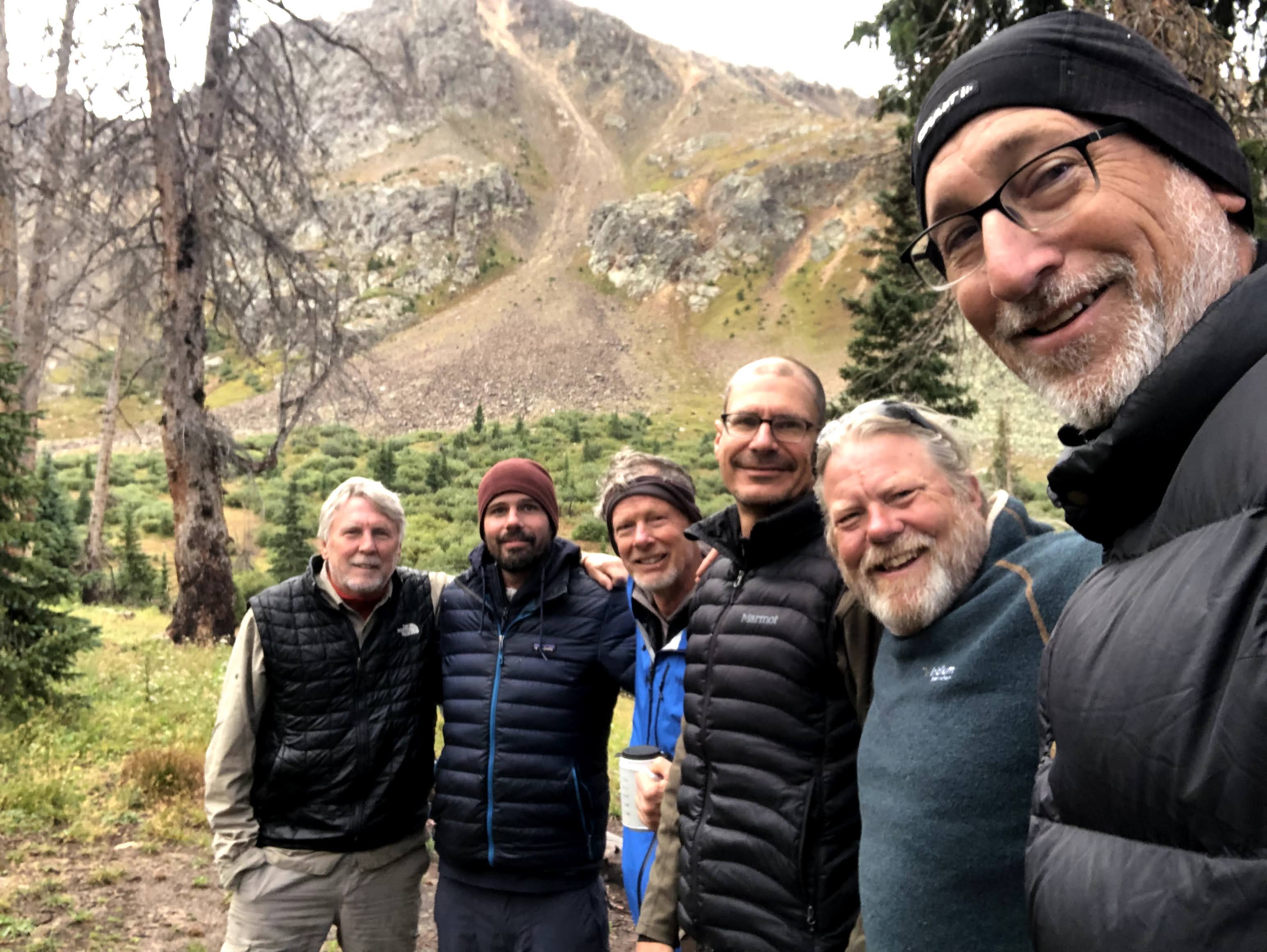 After ten more minutes I was considering going back up when Dan spotted Paul working his way down. By the time he reached us, Dan and I had sat there for about 30 minutes, and we didn’t let Paul rest a second before we started down the big scree field to the next shelf. It rained/sleeted all the way down, and at some point my screen was too wet to work, so no more pictures, and it was impossible to use it to see where we were. I did have my Garmin device, but the screen is pretty tiny, and though I used it for navigation on the ascent, I hadn’t found the feature that simply reverses the route, and then gives a track for descending. My bad. We made it down to the large basin floor, and then I got confused by what I saw. The name of the lakes is Twin Lakes, and when I looked down I saw what I thought was the second lake, and my memory from the first lake was there was a trail from one lake to the other, so let’s just descend to the lake and we are good. Wrong! There are actually two higher bodies of water that feed the lower lakes, and it was these that I saw, and soon we were on the edge of a descent that was going to get steeper, and it just didn’t feel right. Dan, again came to the rescue and insisted that we go back. Paul and I agreed, and we walked back whence we had come and then we spotted the giant rock cairn that marked the correct route, as well as a couple of other descenders, and though it didn’t look like the reverse of our ascent, it was exactly the reverse of our ascent, and soon the real first of the Twin Lakes came into view where Jim and Kevin were awaiting us.