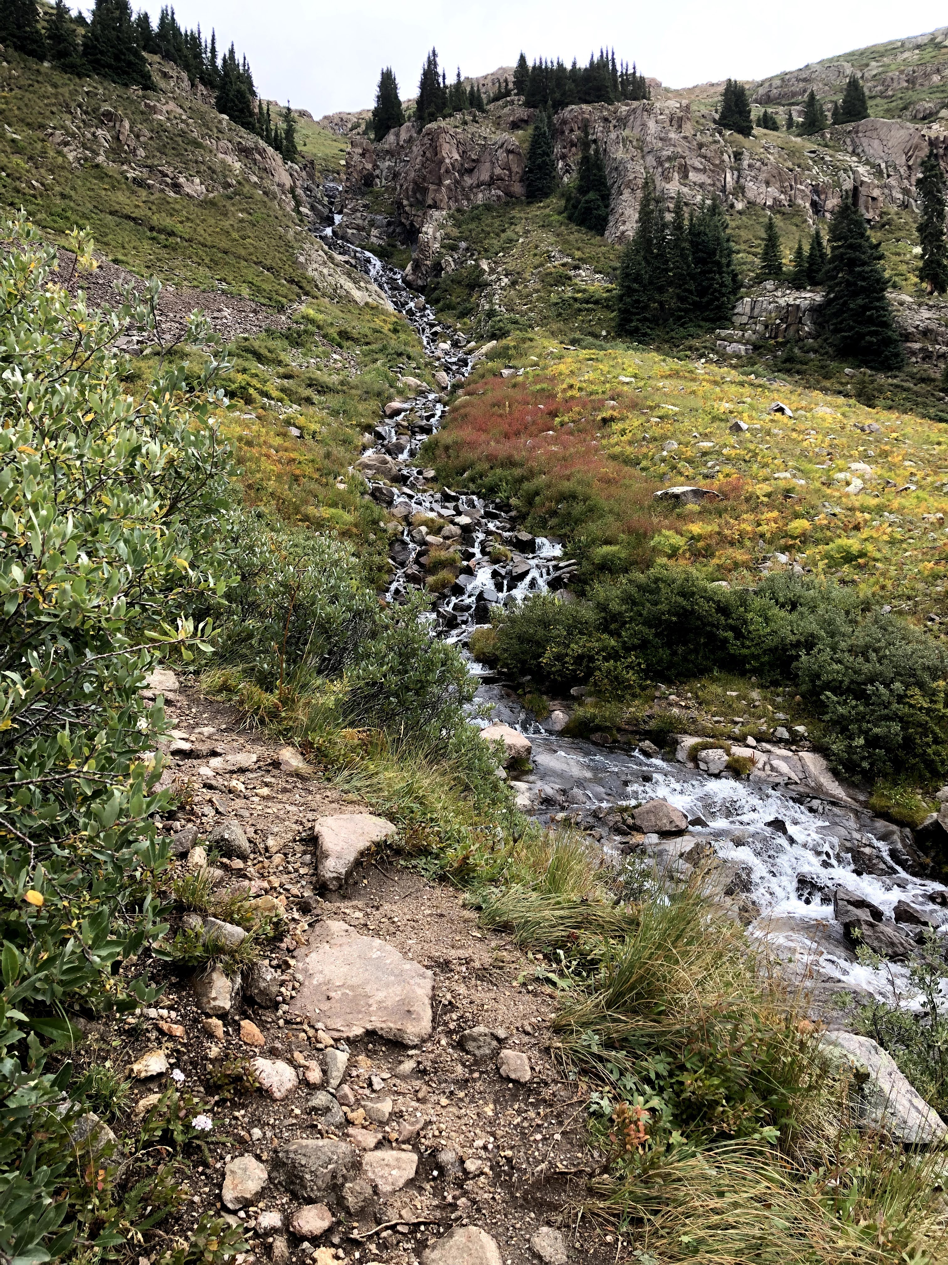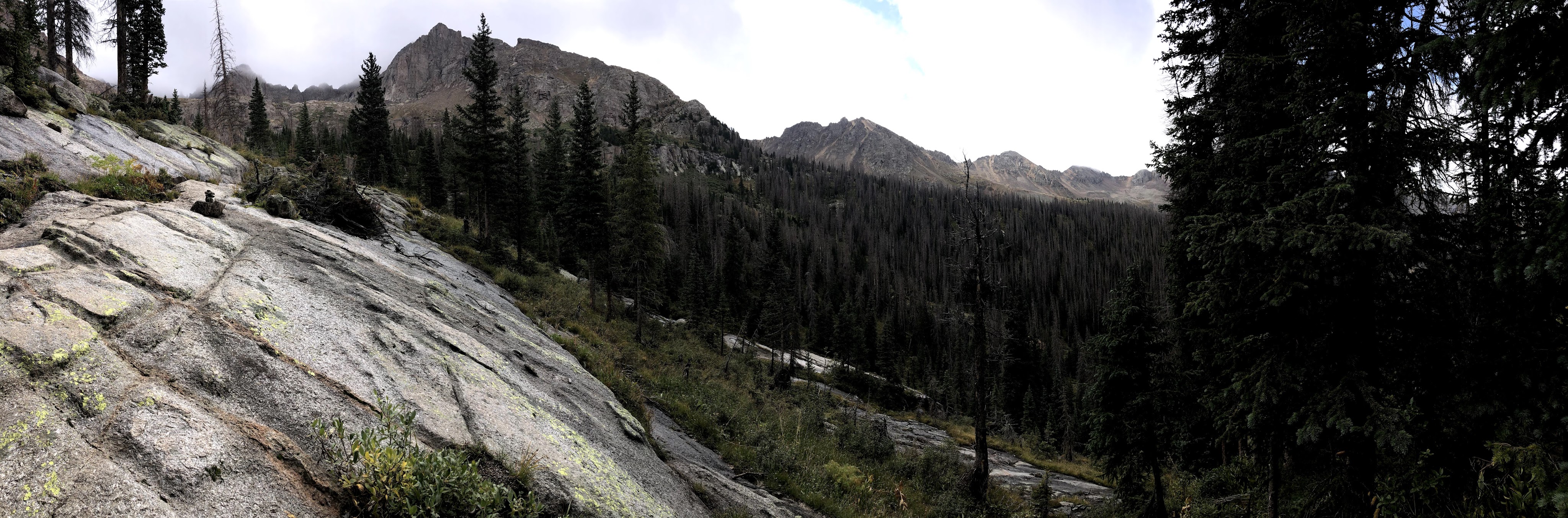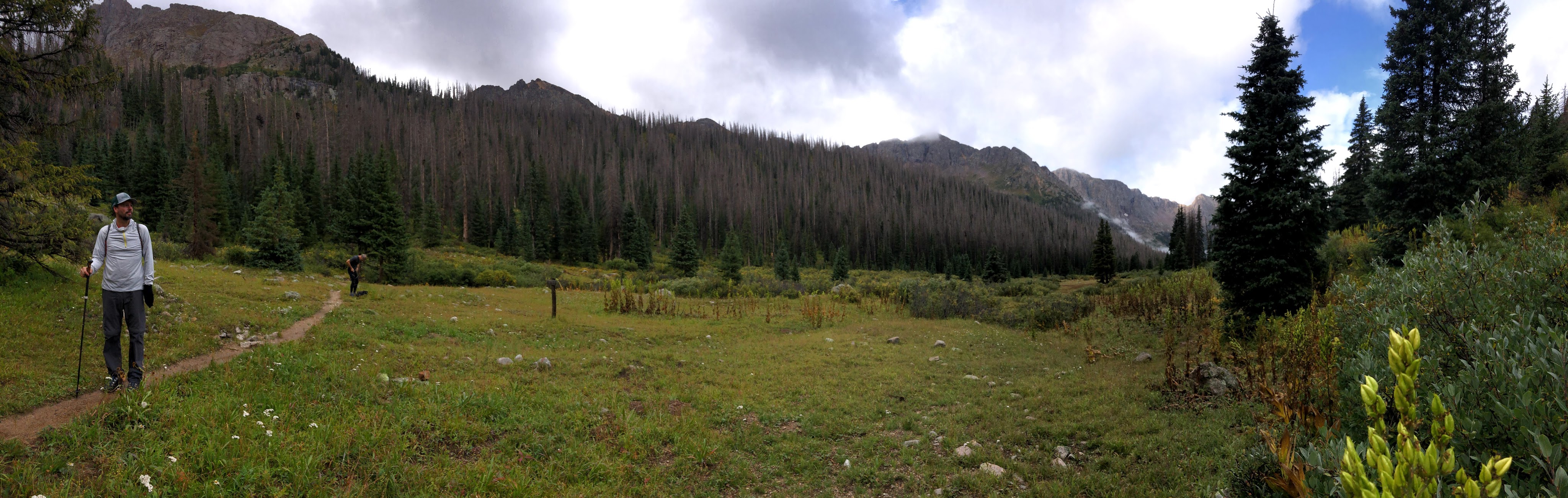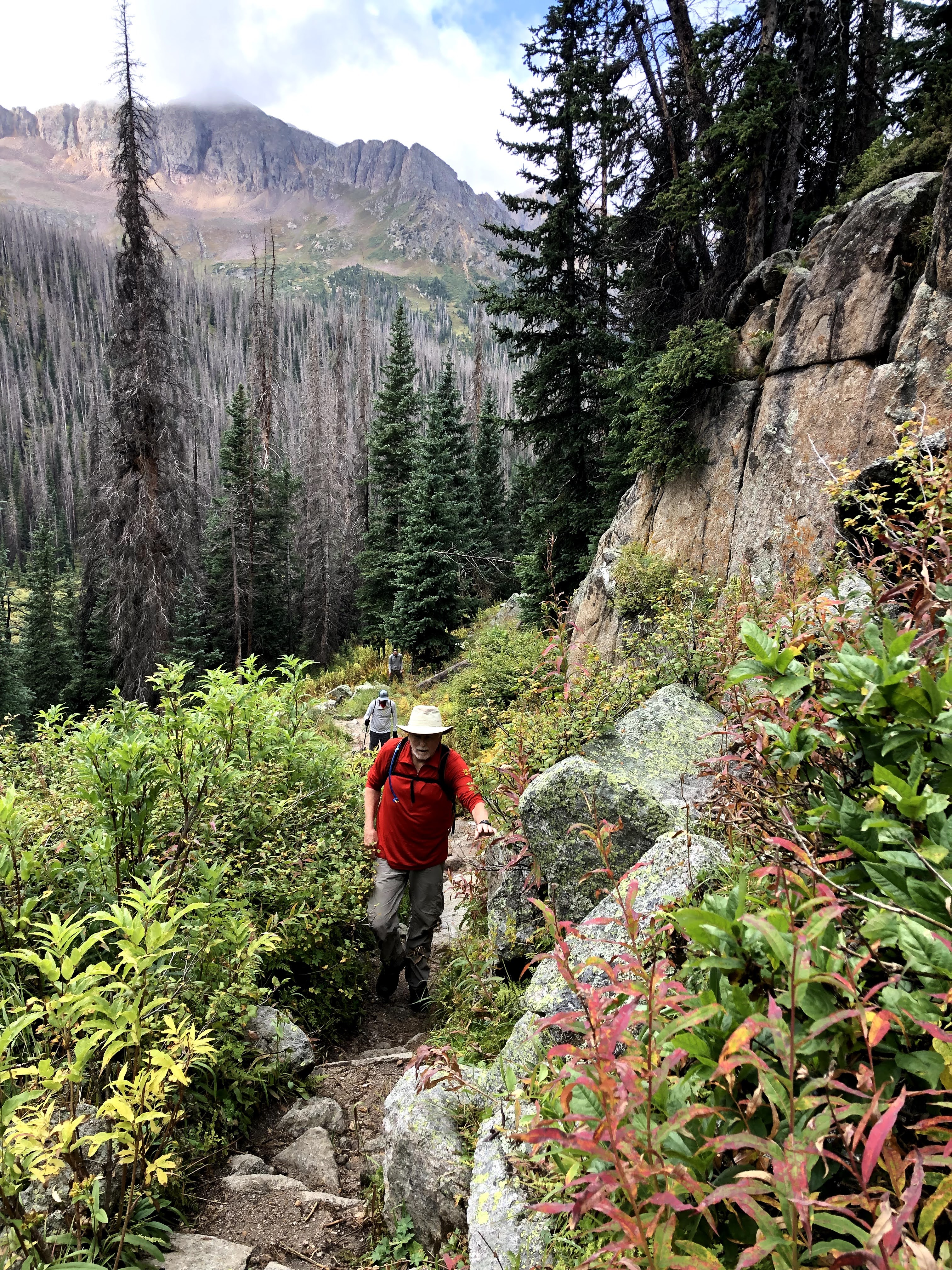The day began as a fine morning with pretty clear skies, and mild temperatures. The forecast for the day included some afternoon precipitation, but nothing like what we had already endured on day 5. With our breakfast consumed, we provisioned ourselves with what we felt was needed for the day. That included some food, water, a Steri-Pen to acquire more water, rain/wind protection, and at least 1 warmer layer just in case. With all that packed into our day bags, and our food hung out of reach of the little critters, we embarked to descend to the ascension point where the trailhead up to Twin Lakes branched off. How much descent was needed, we really didn’t know for sure, but it was on the order of 450′ of loss before we could begin our ascent. The branch being at 11,250′ that would leave 2,824′ to gain over the next 4 miles. In other words, we could be climbing for the next 4 hours, and then we would have to shed that elevation before we would climb again back to our camp. I can see another reason why people who hike in from Needleton don’t camp where we were camped.