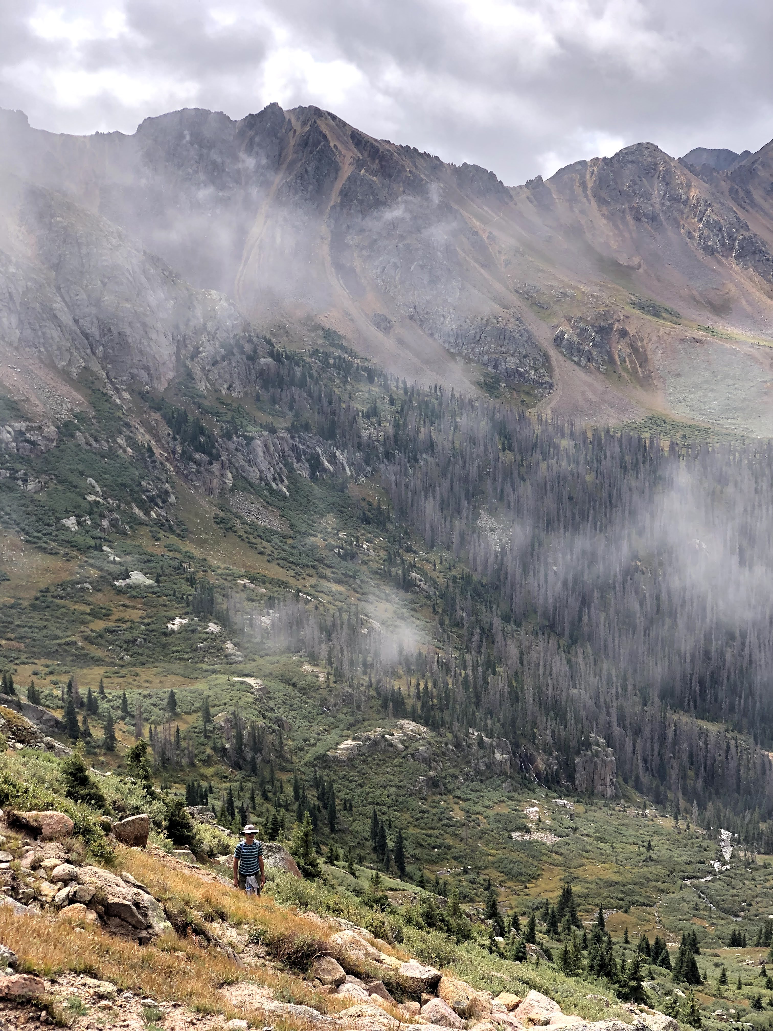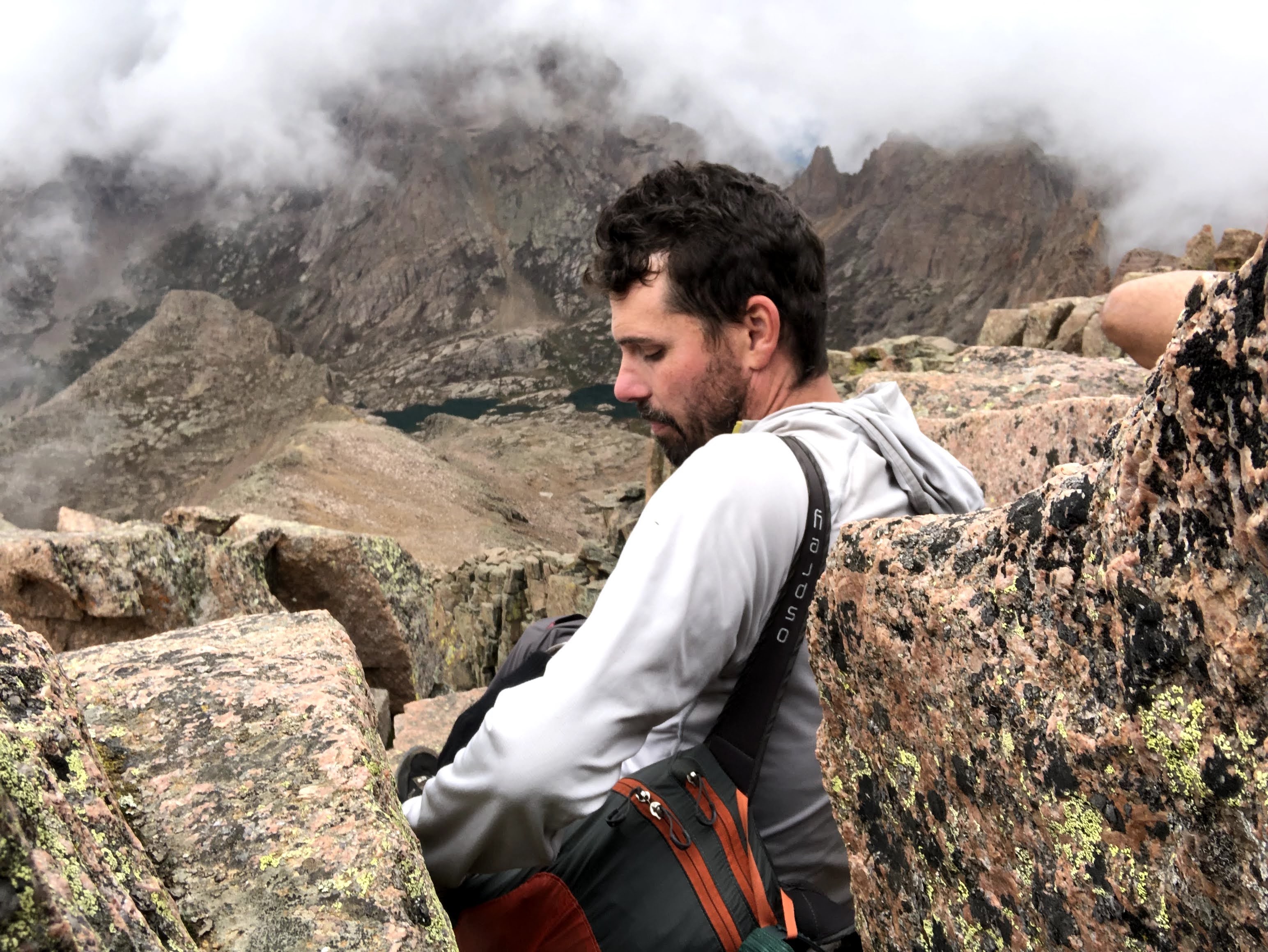Kevin and I got there first, followed by Jim and Dan, and Paul was a little further back when it began to look like the clouds were gathering more and more, and with the breeze, we couldn’t wait for Paul. We gave him some direction where the cairns were, and afterwards we started up the spine. There was a long ascent on the spine, and then the trail edged around to the North side of a false summit where we hit a sunny shelf. Again, it was me, Kevin, Dan, and Jim. Kevin and I reached the shelf first, and Kevin sat down. I didn’t think that was a good idea, but we were at around 13,800′ and the longer Kevin sat there, the less likely I thought it would be that he would keep going. Dan arrived next and stood next to me, and then Jim, seeing Kevin sitting, sat himself. The two of them looked at each other and decided they had climbed far enough. Dan and I looked at each other and continued on for the final push. We actually had to drop off the shelf into a tight saddle and then climb around the South side and up to the summit which we reached around 1:30 in the afternoon. There were three young men there when we got there, and Dan and I managed to find purchase on a few rocks to sit and enjoy the view, when the view came into focus. More clouds are rolled in, and while we weren’t in clouds, our view of the basin was obscured more than a few times. We sat up there for about 10 minutes shooting the breeze with the other summiteers, and then we all decided it was time to get down.