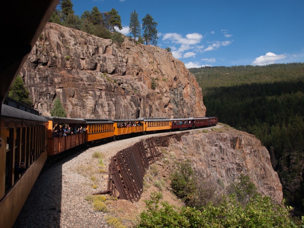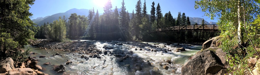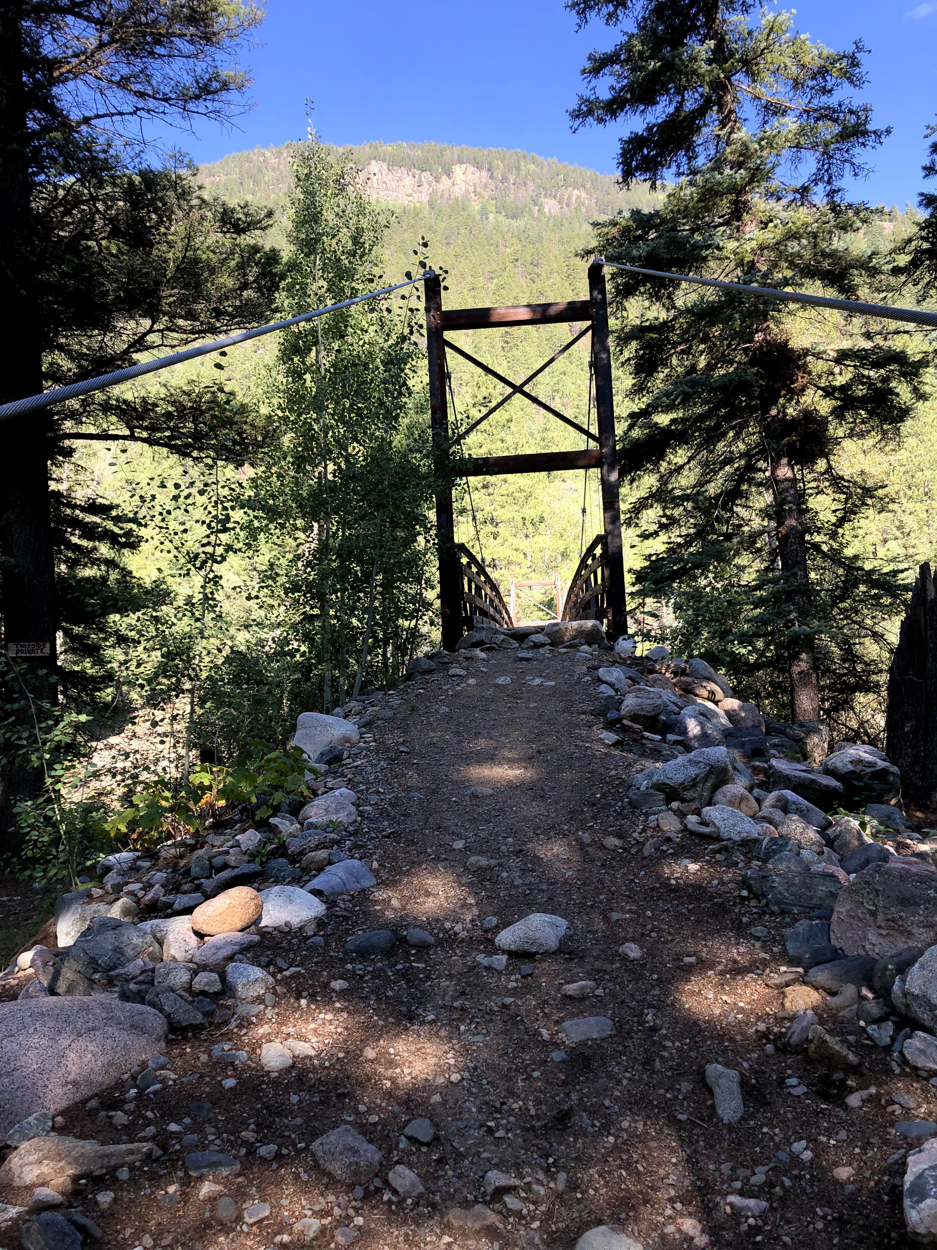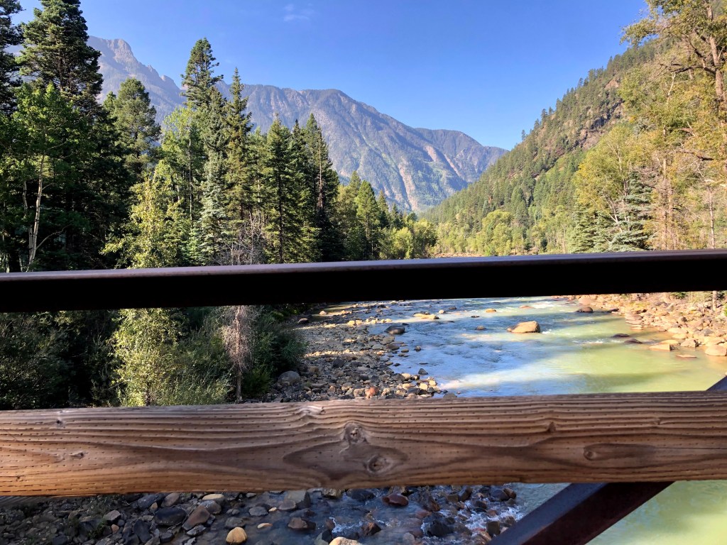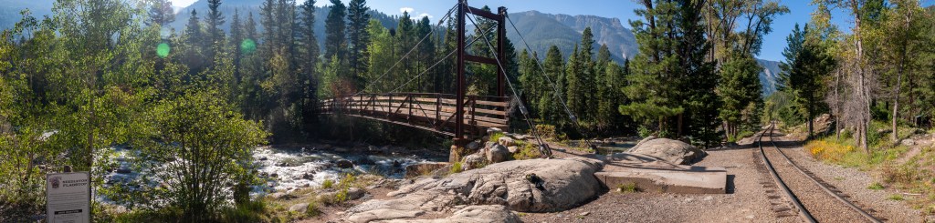 “Durango” and then together we piled into one of the open cars behind the baggage car and awaited the rest of the crowd. Just to note there were a number of folks who did disembark the train, and before we left the stop, they were happily walking across the suspension bridge for their time in the basin. With everyone loaded, the train pulled out and we moved forward towards Elk Creek, where no one got on, and maybe a couple of people got off. No different than when we got off a week earlier. That stop was quick, and soon we were in new terrain covering track that we haven’t seen yet. The train moved from the West side of the Anima across an old bridge to the East side, giving us fine views to the west. I don’t think I thought about it at the time, but the train was cutting behind the two mountain passes I had cycled between Silverton, and Durango, and there is actually an access trail leading down from the road.