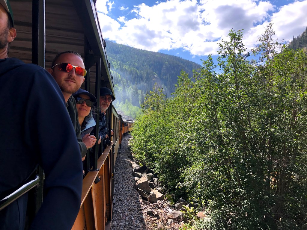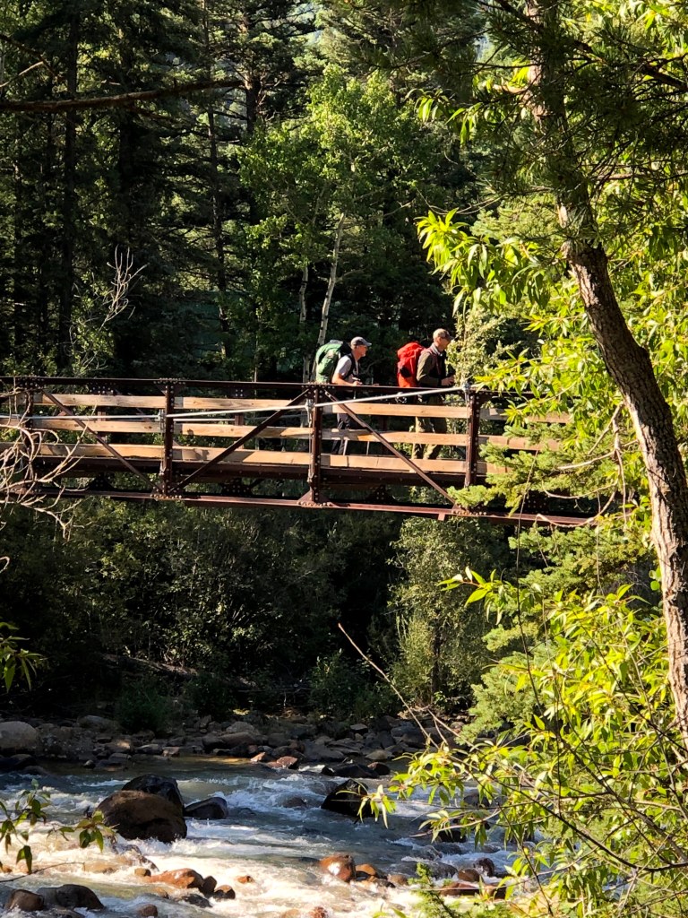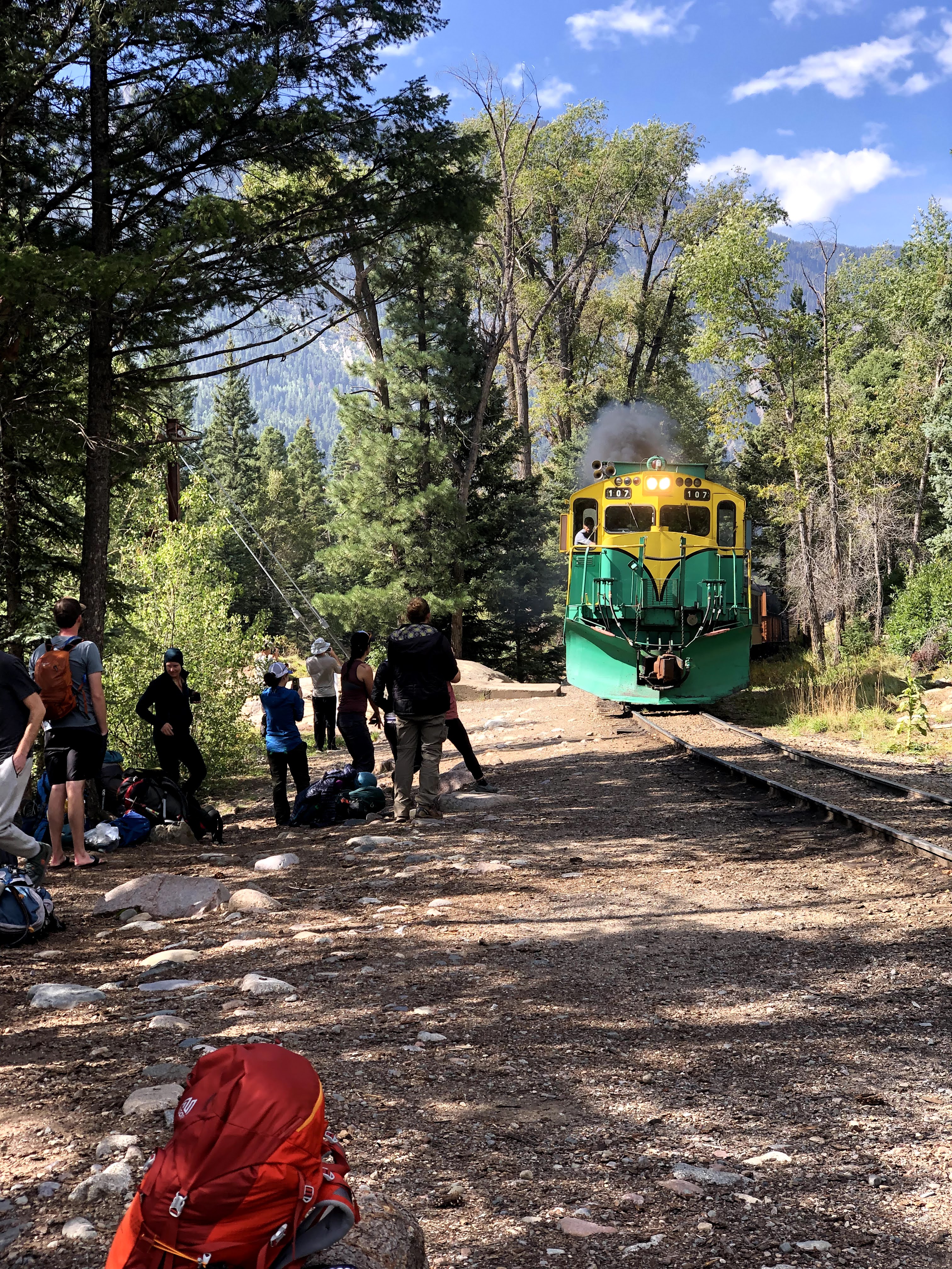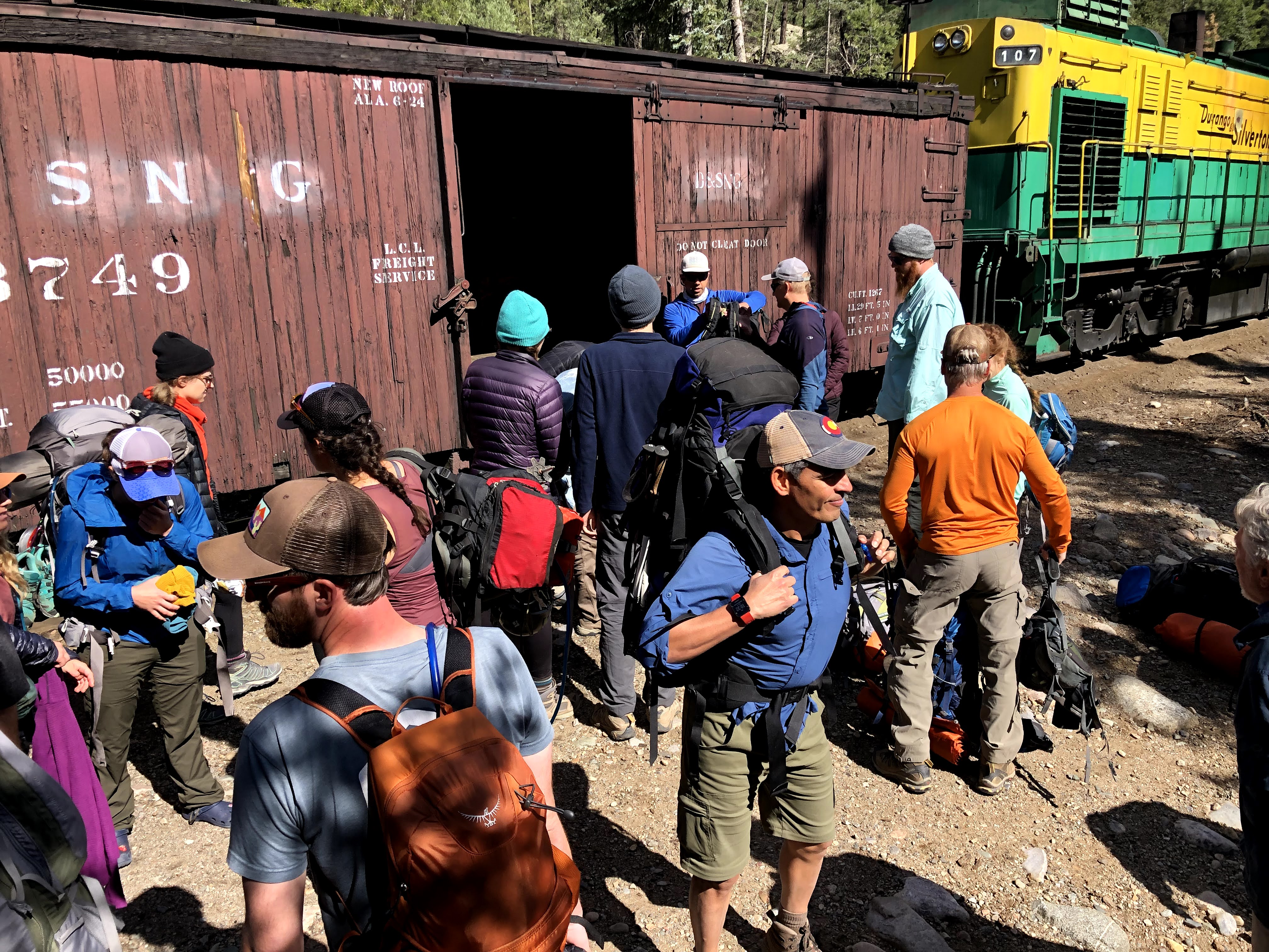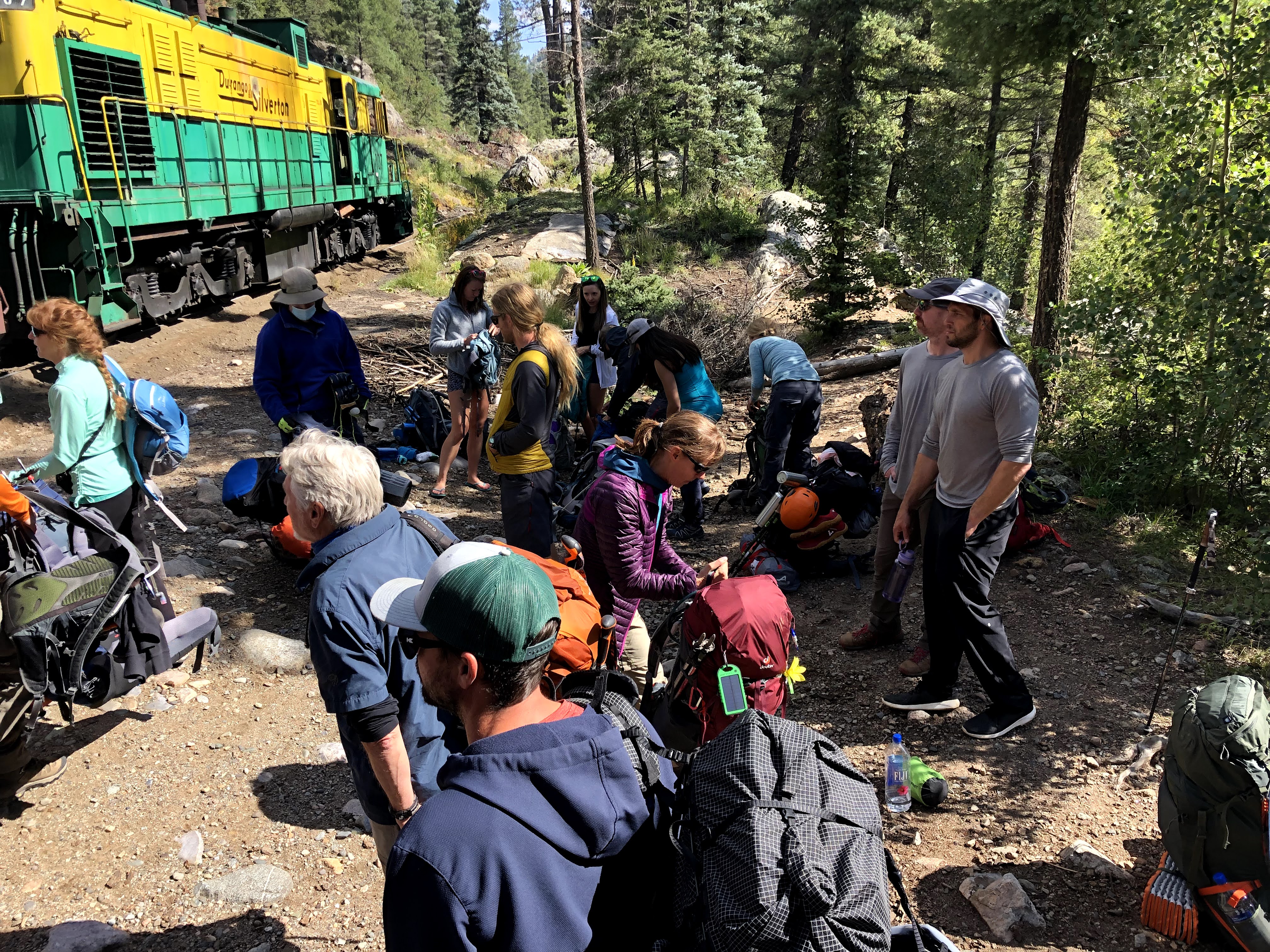 What lay ahead besides a half mile of walking? We hadn’t a clue. When the time came, we made sure the fire was doused, nothing was left behind, and we all marched out of our last camp at about the same time. It was flat all the way, and the only obstacle being a significant suspension bridge to get us across the Animas onto the side where the train would come. We weren’t the first there, and we certainly weren’t the last to arrive. Though it’s a train stop, there aren’t any benches to sit upon. No Starbucks baristas to whip up mocha latte. Just find some shade and await.