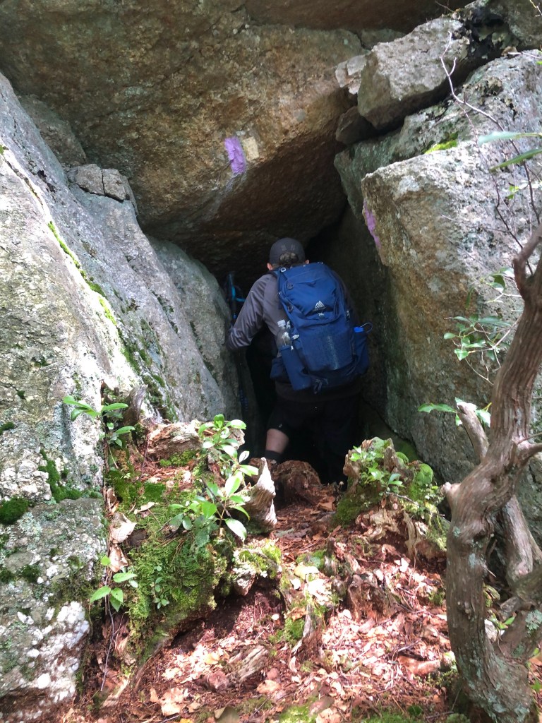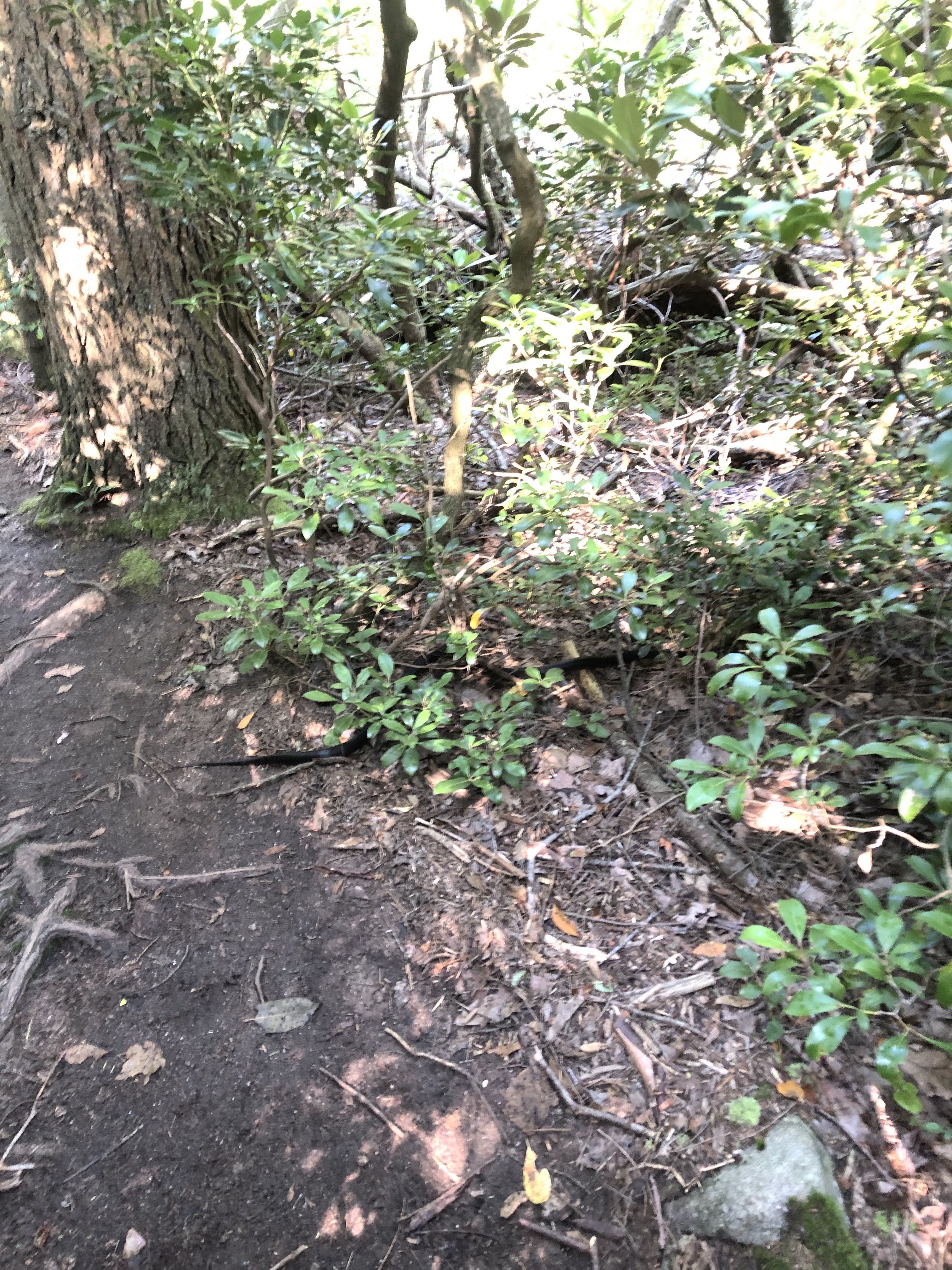 Along the entire trail you are either on slabs of smooth rock or back in the pines and rhodo where the “Moss” and mainly the “Roots” lie. It may be the rootiest (new word) 1 mile I have ever hiked. We weren’t long in one of these root sections when we came across a 4 foot black snake crossing the trail.