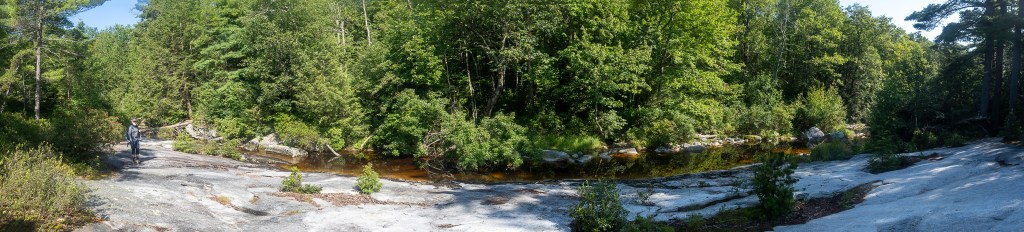 Jed laid out this hike as a mostly footpath experience because 1) we like fewer people on the trail with us, and 2) we like even fewer bikes on the trail with us. Ha! Out of the parking area he started on Mossy Glen Footpath which is a 1.7 mile path that parallels the lower carriage trail but is filled with wonderful eye candy along Peter’s Kill as the next image displays in a multi-shot composite panorama.