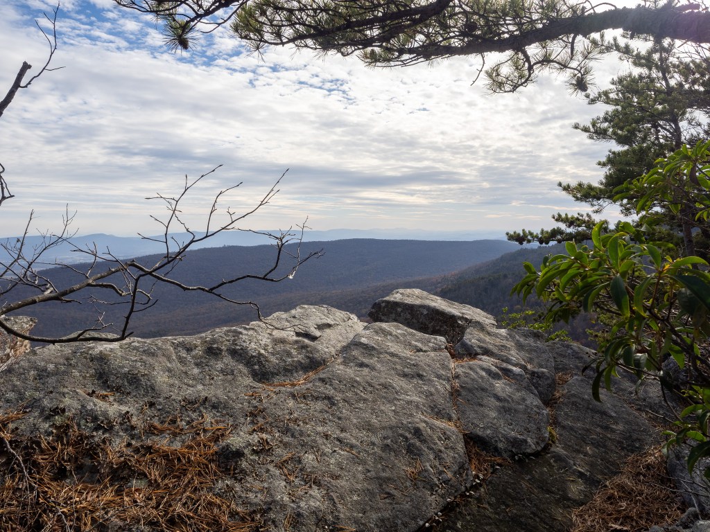That brings us to Saturday’s day hike finally. Better late than never! The goal was to hike up Racer Hollow up to a visible saddle between two mountains where the Tuscarora Trail hugs the border between Virginia and West Virginia. There, we would hang a North and hike to a side trail that descends down the East side to a rocky knob known as White Rocks. Total distance to the Rocks, maybe 4.5 miles and for the most part it wasn’t a very hard hike. And it wasn’t. The trail hugged Racer creek, crossing a few times and gained elevation slowly, and for most of the hour it took, the apparent Saddle never seemed to be getting any closer until we were finally upon it, where we found a nice sized camp that lacked the one important camp necessity. Water. Now we were on the Blue Blazed Tuscarora Trail which had to gain more elevation to get up onto the ridge. It was a very mild grade as well, and hugged the Western edge of the mountain until we finally gained the ridgeline and a nice opportunity to look out over Racer Hollow. Another .7 miles and we reached the side trail to out to White Rocks. By this time, my 85% had me last in line and I trailed into the viewing area of the rocks about 5 minutes after everyone else. Like many of these rocky outcroppings we have visited, it’s a bit of a boulder scramble to get up onto the knob, where you will find some conifers that look like they have lived a hard life gripping whatever they can to maintain their purchase. No limb is straight and we are reminded somewhat of the ancient Bristlecone Pines of the Sierras. There is usually, and there was, a breeze, though on this day, it wasn’t that intimidating, and the Sun was out in full force, so it was easy to set there and relax, eating the food stuffs hauled up there as well as a few cans of beer. I believe there was bourbon but there was a fuck-up and it never found the light of day. Most of us had something easy to munch, however Terry O hauled his stove and all the ingredients to make a soup up there on that rock, and he sat there over in his neck of the knob and soup’d away.