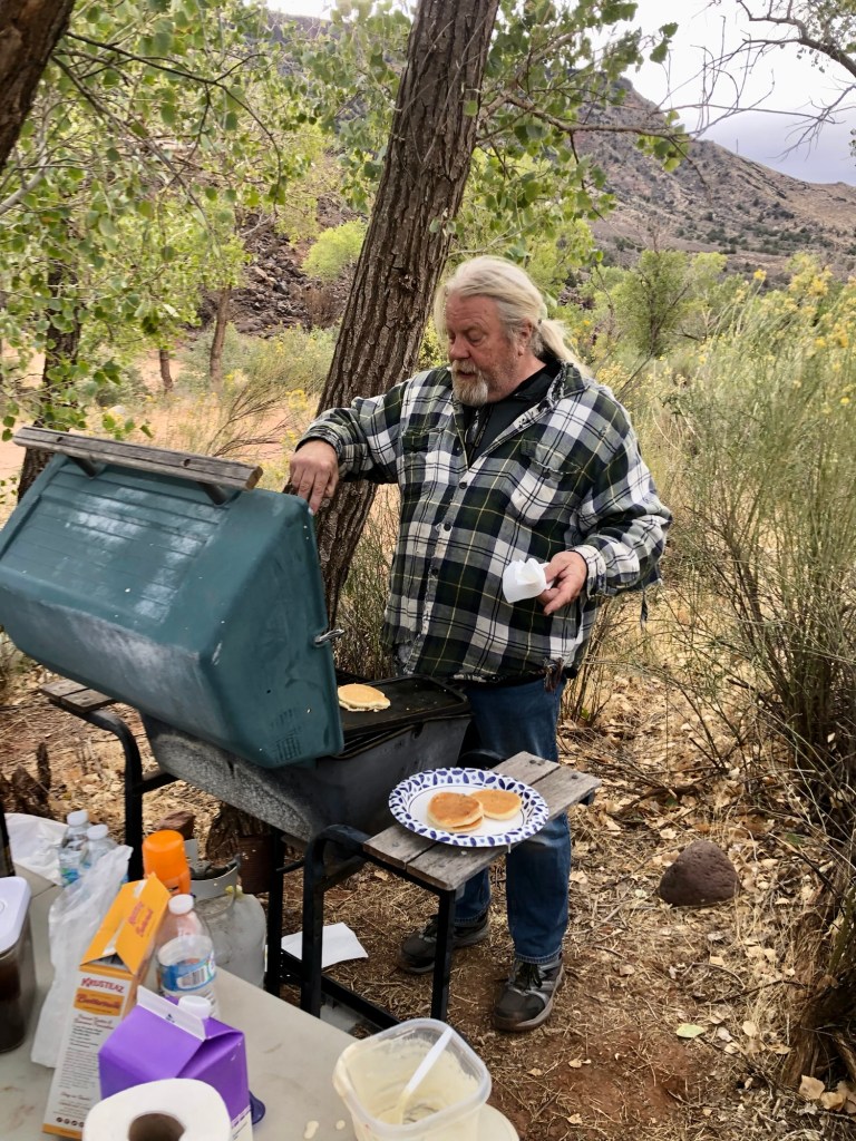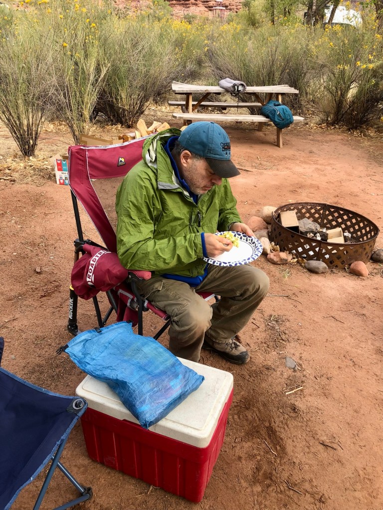 We said our “See yas” and we headed back to Virgin where our campsite awaited. Walt was also in the area, and asked me to pick up some ice, which we did before leaving Springdale, and soon we pulled into Kolob Gardens where it wasn’t immediately clear where campsite 2 was. There was a sign with message written in chalk that said “All Campsites on this side of the creek” while there was another sign that said RV site 2 on this side of the creek while tent site 2 was on the other, and the only way across the creek was to drive through the creek. Reviews for this place mostly said it was a nice quiet spot though the porta-johns were written up as bio hazards. I didn’t want to cross that creek, and th #2 site was too open with the wind, so we grabbed the #7 site which offered up a little bit of protection though with the wind as it was, there wasn’t going to be any fire on this night, even though Terry and I spent some time getting wood from Buffalo Bill’s Trading post in Virgin. Btw that place looks to have a very promising Burger for anyone interested in good burgers. We have sites 4 and 7, the wind is blowing, but we have our tents set up and Walt is trying to figure out how we are going to do dinner. He brought is grill all the way from Arizona however we had to build an obstruction to the wind in order to get it lit so we could cook. Walt brought Brats (including some vegan brats for me) as well as some toppings and other things to eat, chairs and beers and so, settled in we sat and Walt took care of us. A late addition to the car camping crew was Andy Shoneman when Larry Butler decided he could not make it happen, so we were four backpackers and four car campers for a very nice overall grouping of friends having a fun night in the wind. Yes, the wind blew, but we cooked, we ate and we had fun that night, and when it was all over we cleaned up and went to bed when it got too cold.