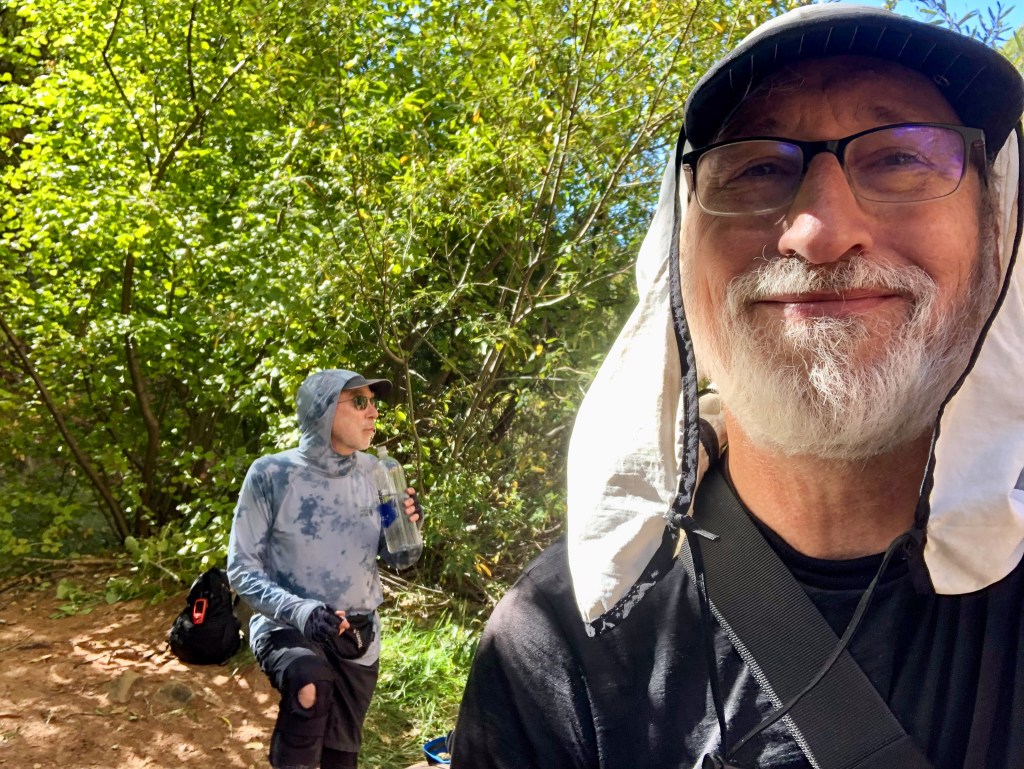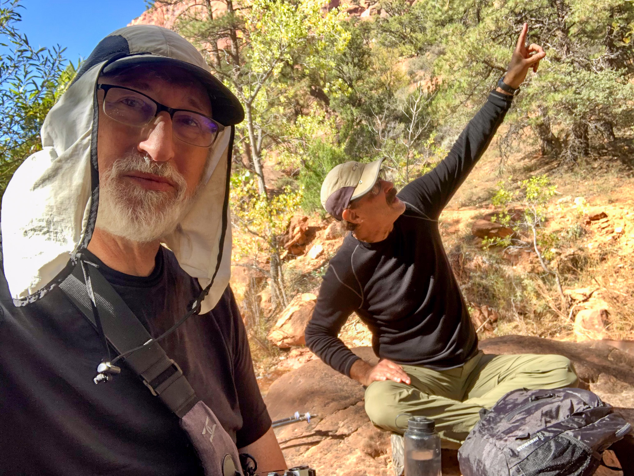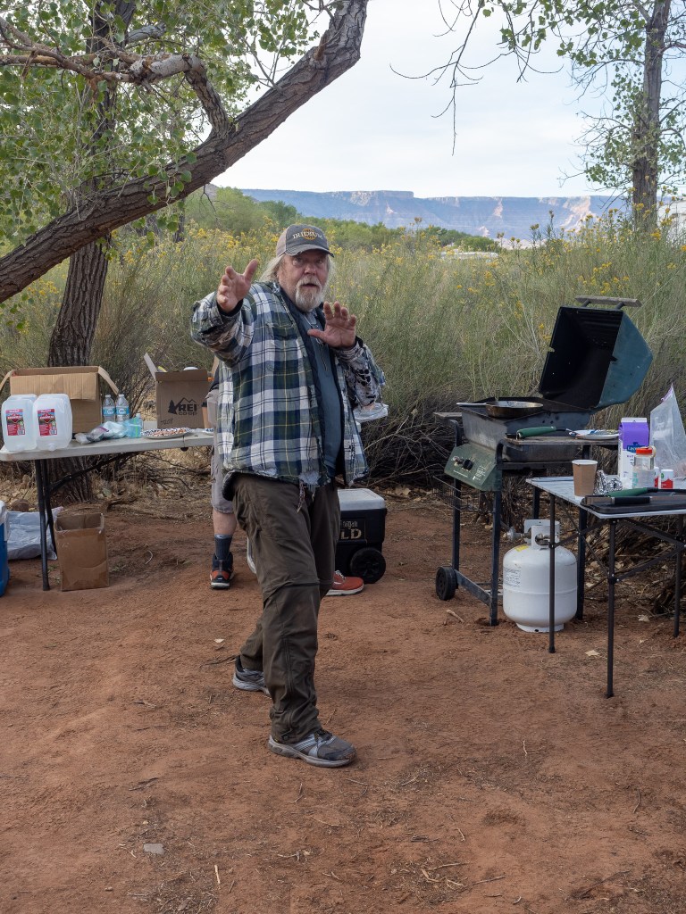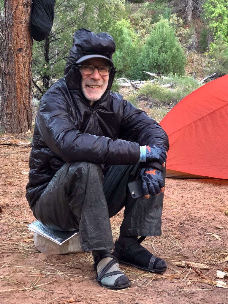 While we were settling in, I could see across the creek and the tenants to site 8 had just arrived, so I greeted them “Welcome Campsite 8 campers! Welcome” and I got a hand wave back, which of course meant I needed to cross the creek proper and see who our neighbors were. It was early still and we would not eat for another hour, so I crossed the creek to meet Janna, Betsy, Gary, and the other dude. They were all from Indiana, greater Indianapolis area, and like us they were in Kolob for 2 nights, but unlike us they were hiking out and heading somewhere else. Not wanting to overstay my welcome, I retreated back to our camp where everyone was ready for each of their own specific freeze dried meals and just as we were getting started to young women walked into our camp with two looks on their faces. The first was one of relief that their trek this day was over. The second, “Why are these old men in our campsite?”. We welcomed them to our camp, and made the assumption that perhaps we had both been issued this site, so I offered up “There is plenty of room for all of us here”, but they soon realized they had site 10, and had just a short wee little extra to go. Before they left they told us their plan the next day was to haul their asses all the way to the West Rim. That’s 20+ miles. That would mean only 2 nights worth of food, but they would still need an early start to knock that out. Doable yes, but not for me.