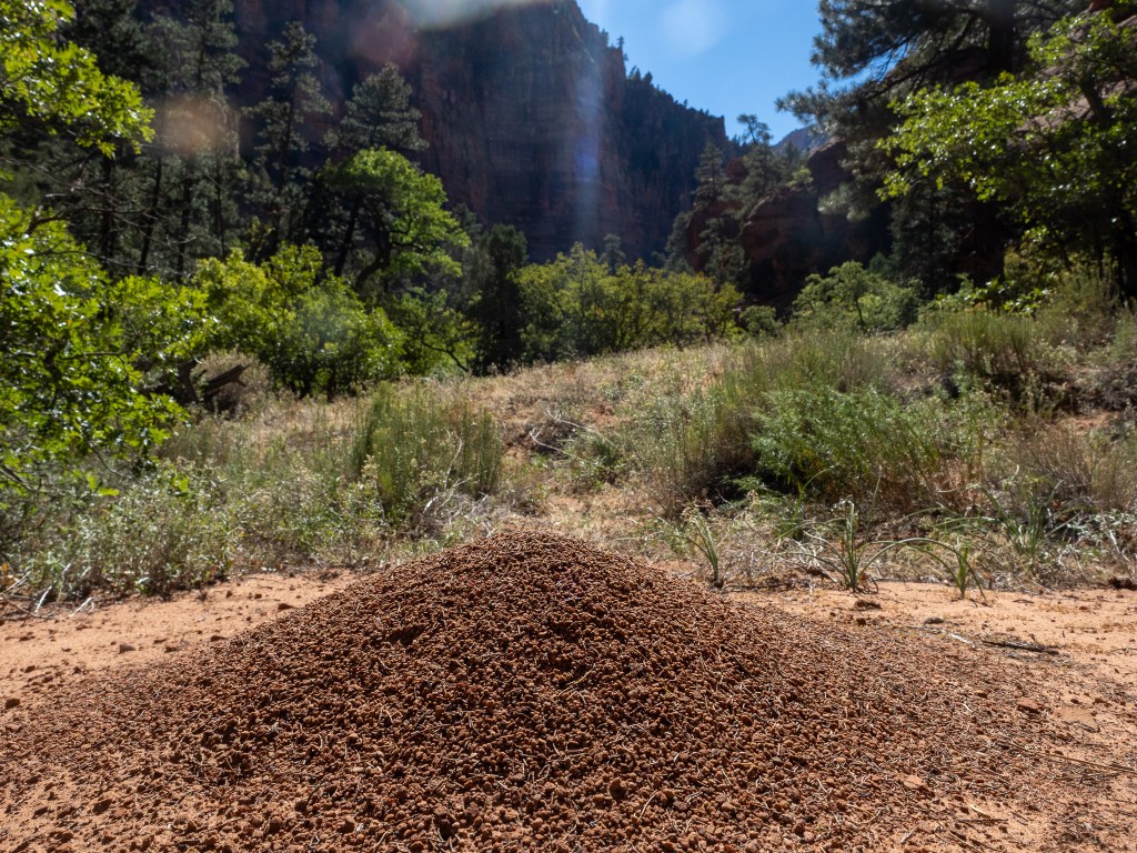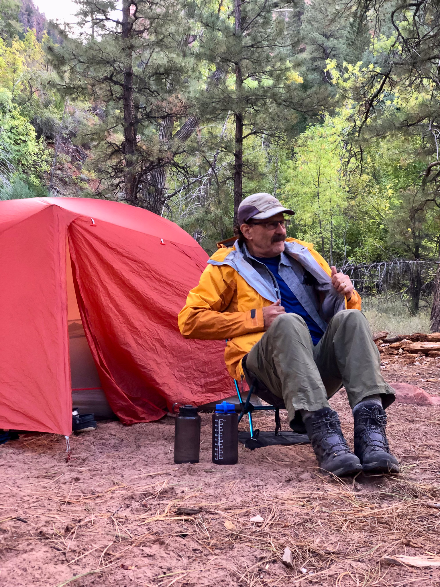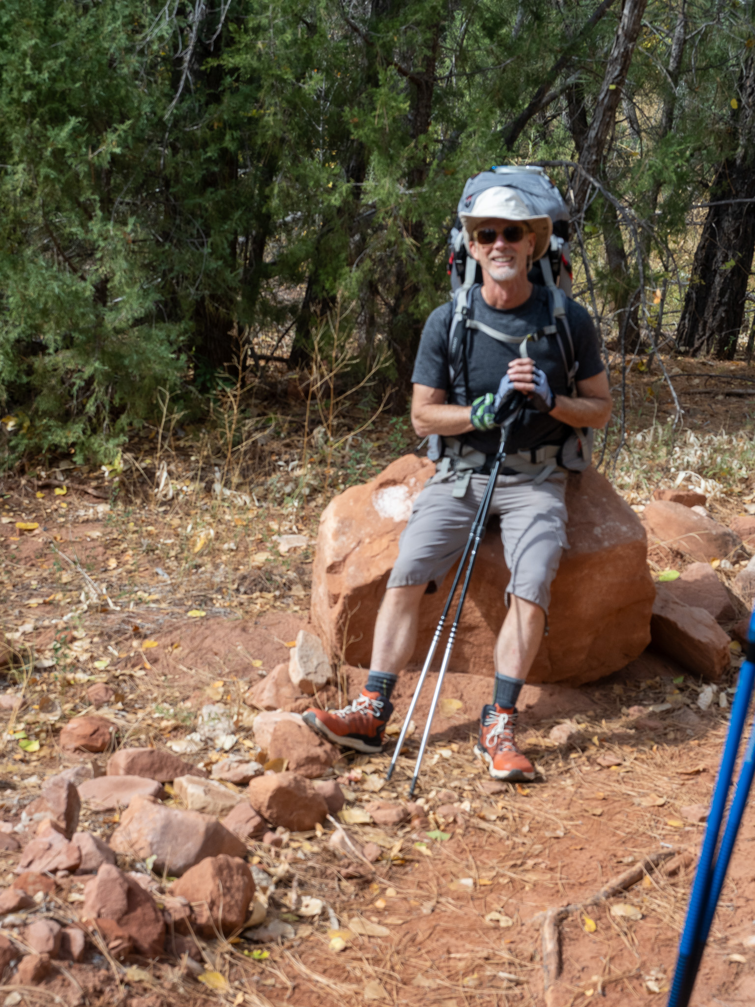 While we were settling in, I could see across the creek and the tenants to site 8 had just arrived, so I greeted them “Welcome Campsite 8 campers! Welcome” and I got a hand wave back, which of course meant I needed to cross the creek proper and see who our neighbors were. It was early still and we would not eat for another hour, so I crossed the creek to meet Janna, Betsy, Gary, and the other dude. They were all from Indiana, greater Indianapolis area, and like us they were in Kolob for 2 nights, but unlike us they were hiking out and heading somewhere else. Not wanting to overstay my welcome, I retreated back to our camp where everyone was ready for each of their own specific freeze dried meals and just as we were getting started to young women walked into our camp with two looks on their faces. The first was one of relief that their trek this day was over. The second, “Why are these old men in our campsite?”. We welcomed them to our camp, and made the assumption that perhaps we had both been issued this site, so I offered up “There is plenty of room for all of us here”, but they soon realized they had site 10, and had just a short wee little extra to go. Before they left they told us their plan the next day was to haul their asses all the way to the West Rim. That’s 20+ miles. That would mean only 2 nights worth of food, but they would still need an early start to knock that out. Doable yes, but not for me.