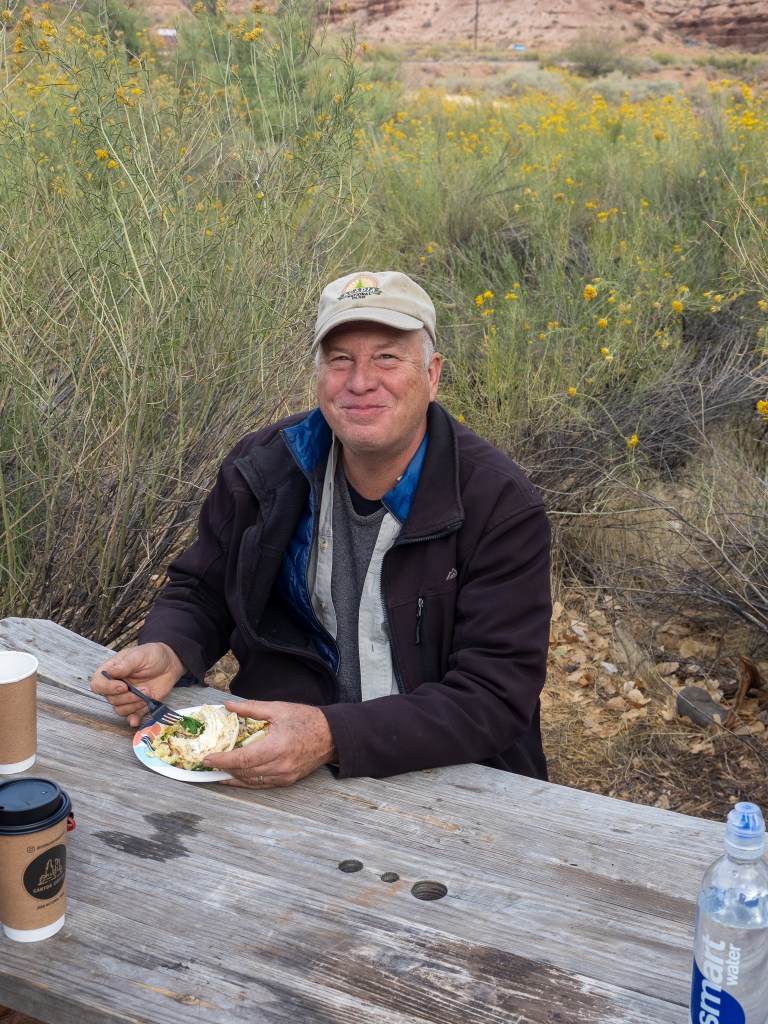 We however awoke lazily, except for Jim who was up and stomping up and down the local area looking for early light images, and without the need to break camp, simply gathered our food stuffs, and started to boil water for coffee drinks and oatmeal. On this trip I told everyone “No more quick oats”, instead we would use whole rolled oats that require a good soaking in hot water, and I got everyone to wash out their previous nights dinner package to resuse as their oatmeal soak sack. Same principle as the dinners; Add hot water, shake/stir/seal enclose in bubble wrap, and under the shirt for 8 minutes. I found the texture of that method was much improved over the quick oats. No one said “This method sucks Eric”, so I can only assume that they too found it better, but I am not sure any of them eat as much oatmeal as I do, and they might just be humoring me. Coffee drinks consumed, some people, one by one grabbed their Restop2 bags, and retreated into the brush to give their backsides a go. “That was easier than I thought” was one comment. “Better to bring a little extra TP with you” another. I wasn’t moved to go yet, and so I rolled the dice for the day.
