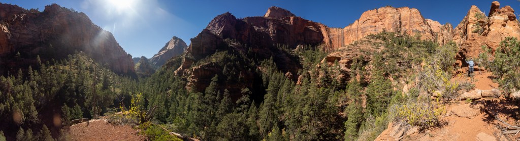 Soon we traveled as far into the side canyon as I had with the other crew 13 years prior, and at that viewing point, you can indeed see the arch from one spot next to a giant Ponderosa Pine where a sign discourages hikers from proceeding further into the canyon. I suspect that it gets rougher, and maybe the risk of injury increases, however behind us and to the right there was a fairly well worn trail that looked like it gained some easy higher ground that might offer up a better viewing experience, so we followed that and indeed we had a wider field of view. From this point, I am going to say that though the trail did continue up, and there were two more vantage points, it did look more like a scramble, but it didn’t look dangerous, and we could see an outcropping about 30-40 feet above us that looked like a nice place to snack, and so we moved up. Yes, there were some dodgy sections, but we all made it safely, and the shelf was more than large enough for all of us, and we sat up there for at least 30 minutes. This shelf did offer up a tremendous 360 view which I captured roughly 270 degrees in a multi-shot composite panorama that captured Jed, the arch and the exit back to main Kolob.