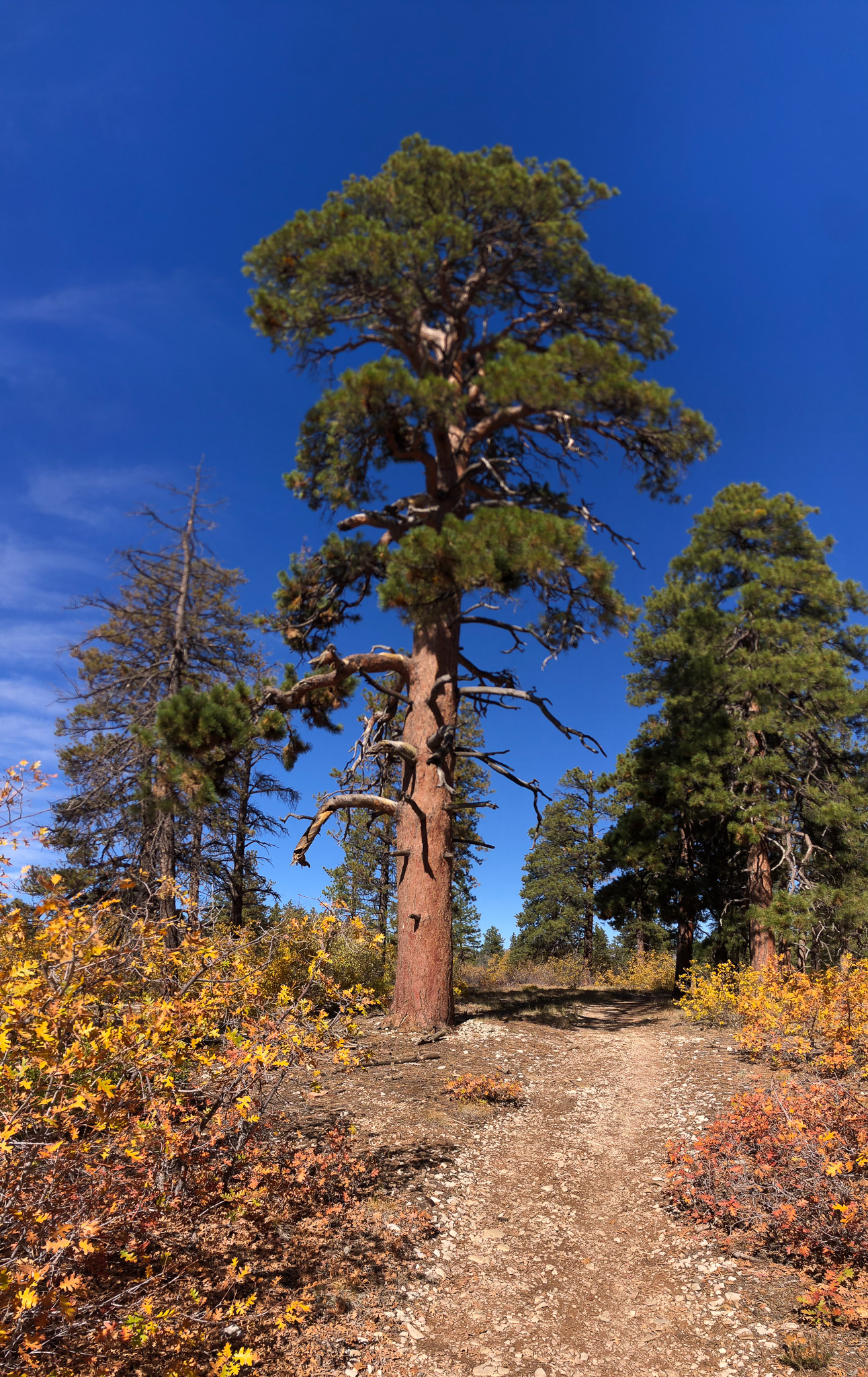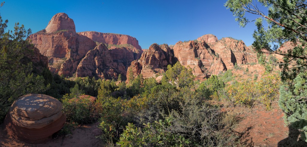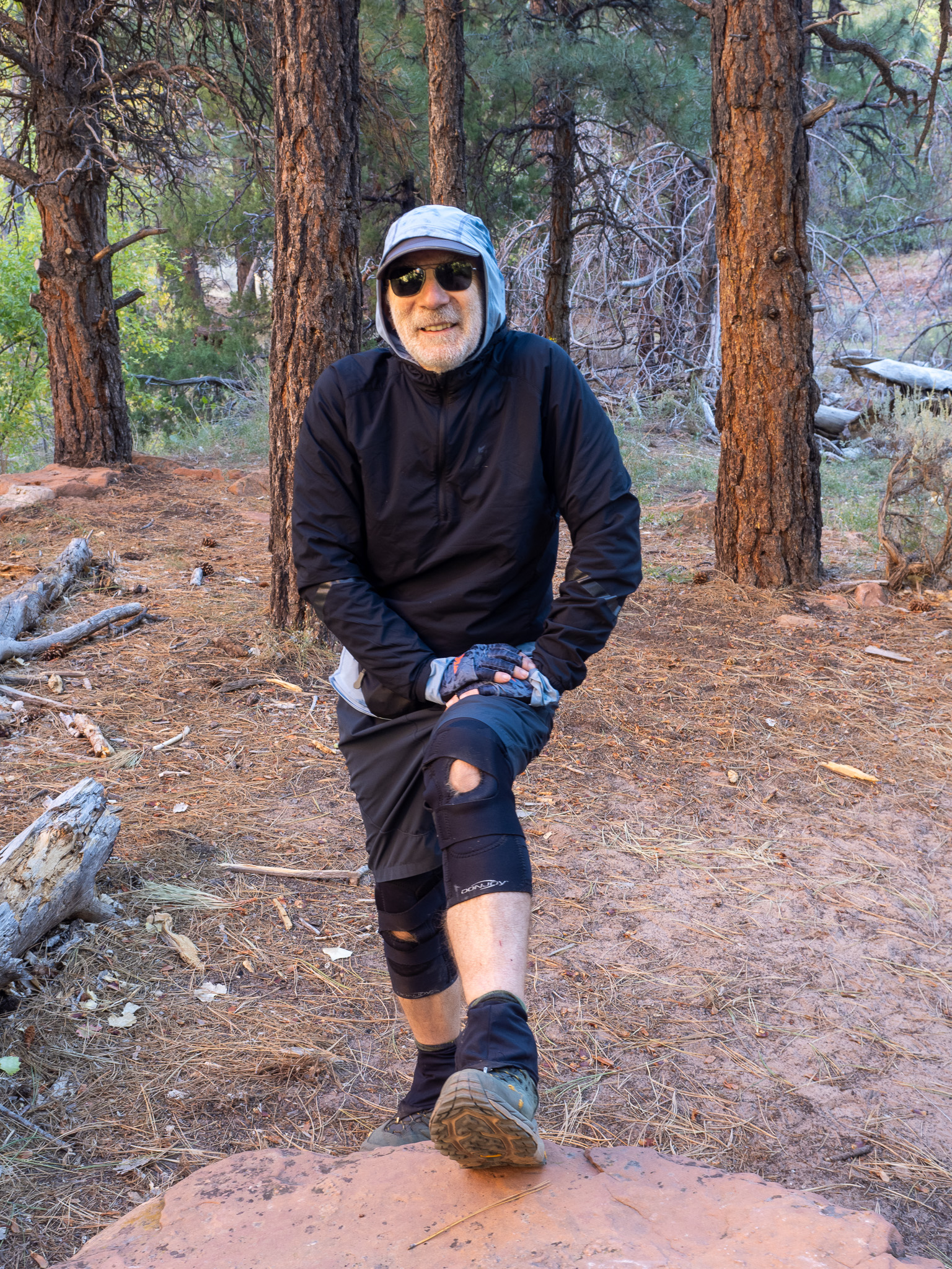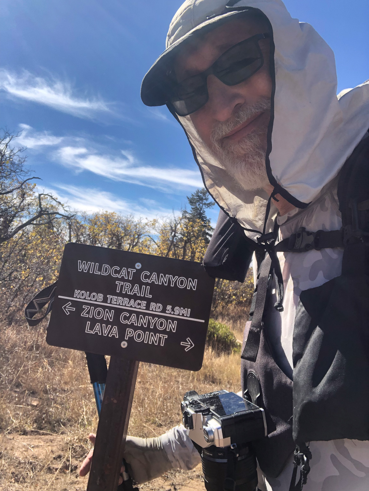 The connector trail was indeed hard to follow in more than a few places, those being areas of climbing slabs of exposed rock, however you can see that people put various markers along the trail to follow, so it isn’t as hard as you might think. The Connector Trail started out no different really from the HV trail on the Kolob Terrace, because we were still on the terrace, however the job of the Connector is to get us from the terrace upto the Wildcat Trail nearly 1000′ higher, so it wasn’t long before the scrub oaks of the Terrace gave way to the higher elevation Ponderosa Pines. As we hiked along, I was never sure exactly where we were going to gain the elevation. With so much exposed rock it wasn’t easy to see a trail scaling up that, but the closer we got then the more details you can see, and that there are indeed places for a trail to switchback and navigate the terrain. I think by this time we were all feeling the results of the rigors of the day. Jim admitted in his accounts on Facebook that he saw a huge reduction in the number of images taken along that portion of the day’s hike. I managed to snap a few composites with my Mirrorless, and my iPhone camera was getting worse in high contrast light, so few images from that device. Jim had announced “Don’t leave me too far behind, I am just going to go at my own pace”, which a few others echoed back as well. I led us through most of this, taking moments to pause, catch my breath and allow us all to gather again. After a couple of hours, we arrived at the junction with the Wildcat TH, where I wish now, we had made arrangements for Mike to be.