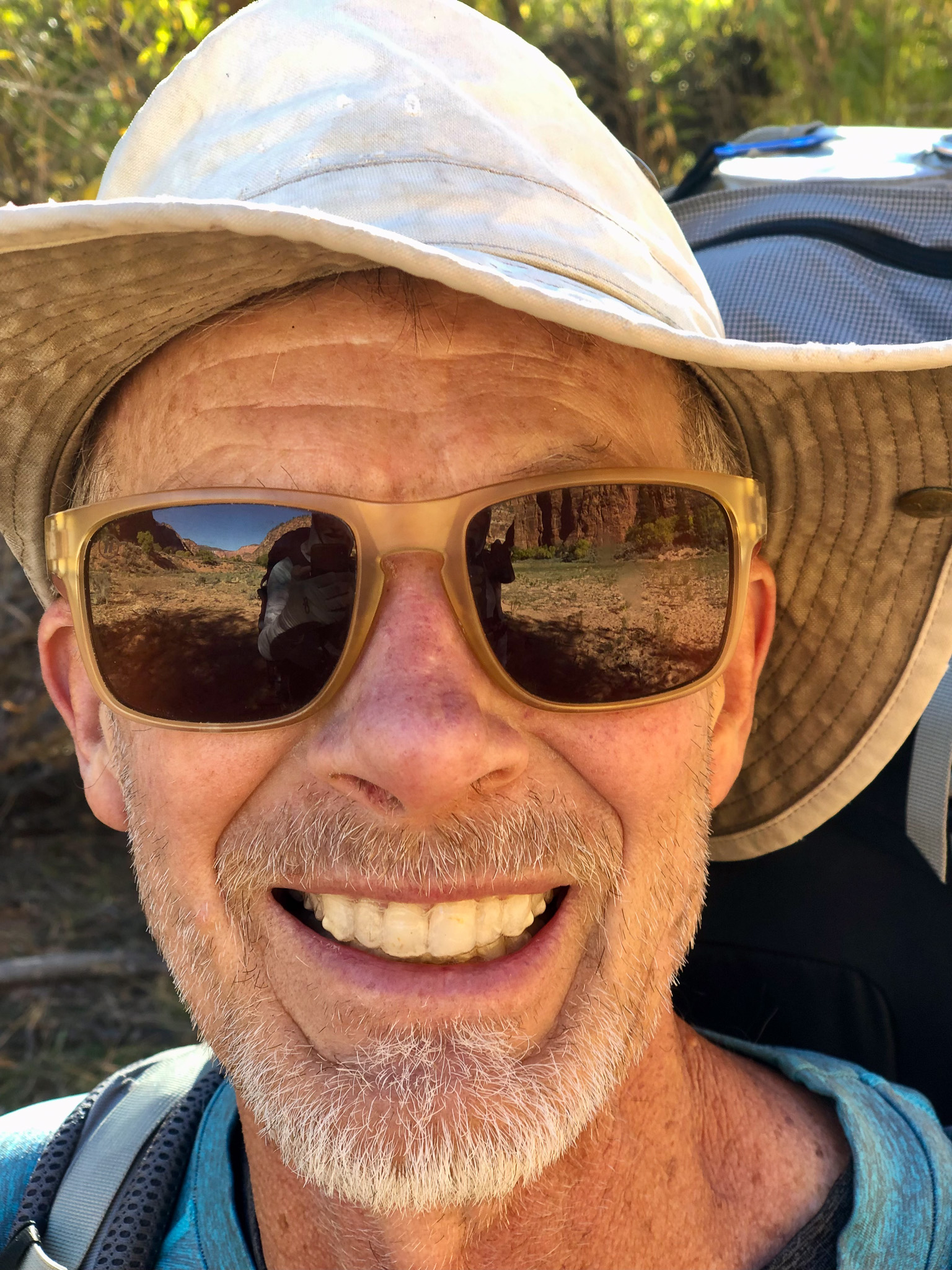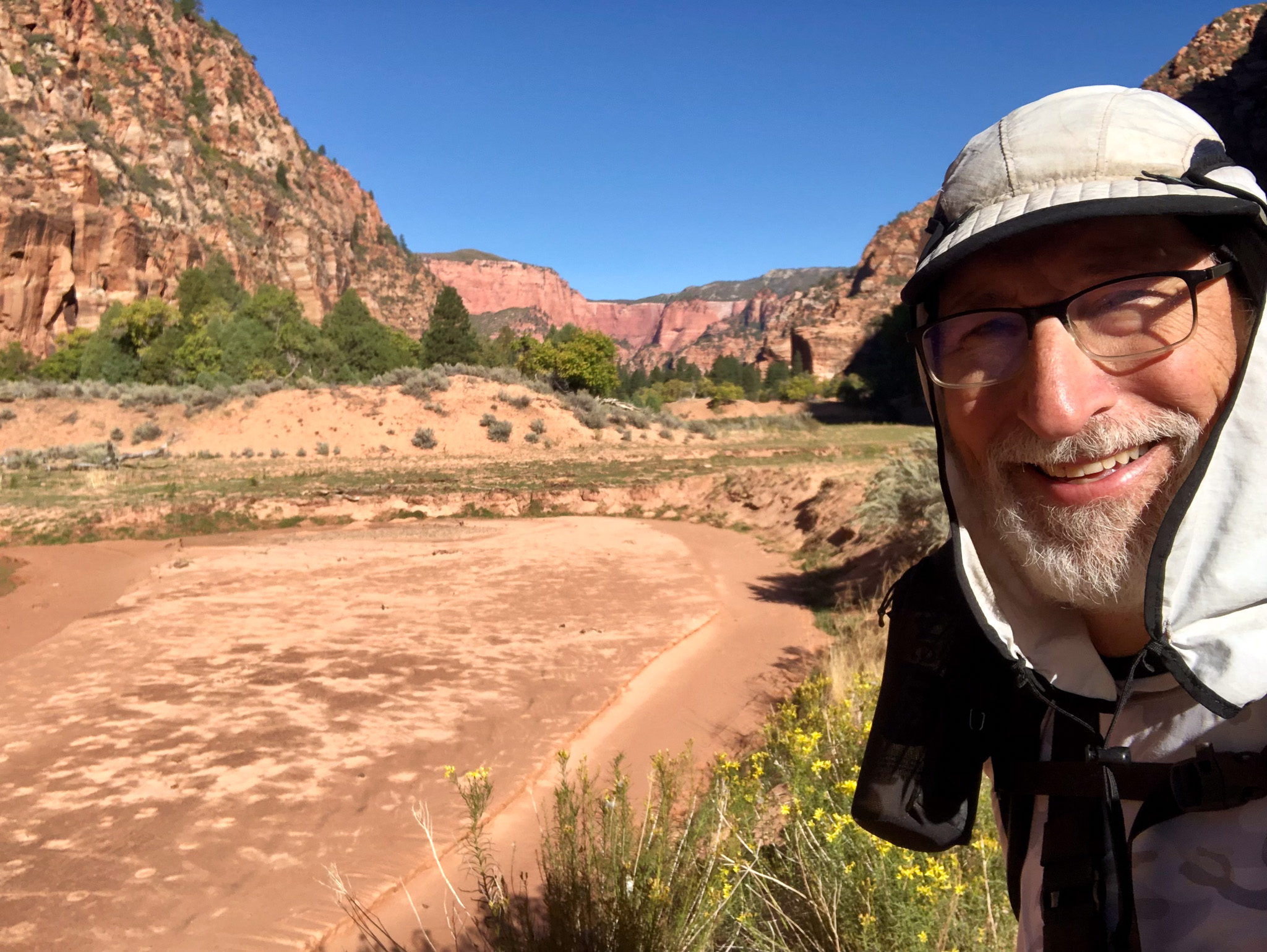 The second segment of our Zion traverse includes what I have called Death March 1, and Death March 2 based on how I felt at the end of each of those two days, which was exhausted. Just to be clear, this is not like a Solzhenitsyn march where you know from the start what kind of day it will be, but rather each day began just like any other day when you backpack and have to move camp pretty far along the trail. Don’t sleep in; Pack your sleeping bag, and deflate and stow your air pad before you exit the tent; Breakfast on oatmeal, and coffee drinks, water up, and pack the rest of the things; Groan while raise the potential energy of the pack, and start walking, a smile on your face, and nothing but happy “What will today bring?” expectations ahead.