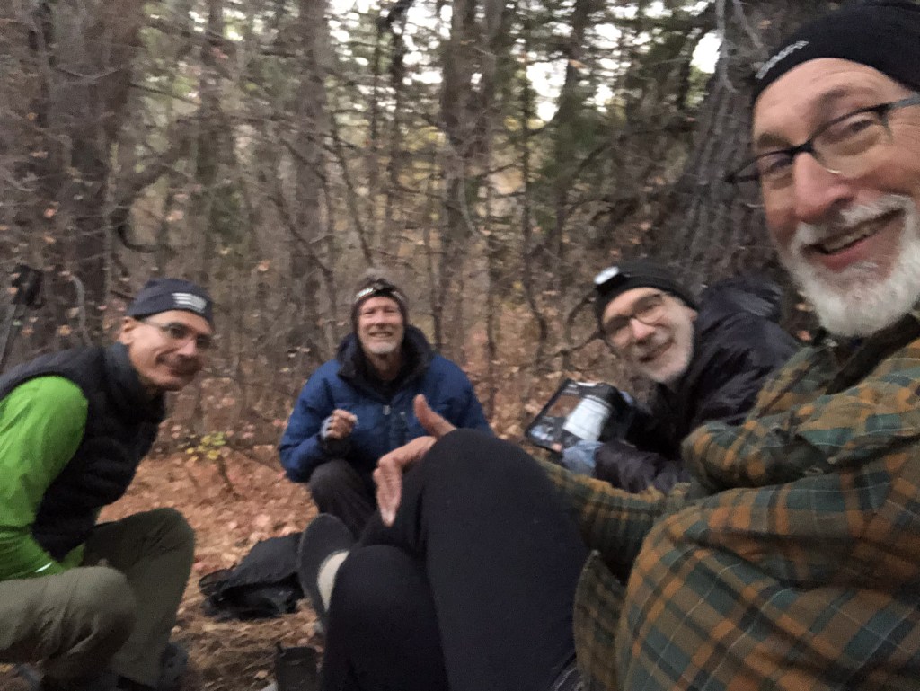 Back at camp, Mike had greeted our return by waving to us when we emerged into the valley. There wasn’t a lot of daylight left, so we got started on our dinners, and awaited Paul’s arrival. I decided to send a message to Paul’s loved ones just to keep them in the loop, that I know they know he is out there alone and walking, and we are keeping an eye on the clock and anticipate his arrival any time. As we ate our dinners, and the light faded more, I will admit a wee bit of worry on my part, enough at one point to grab my head lamp and to venture out onto the trail to intercept him. I did test the echo nature of our Valley, and it was a very nice echo indeed, so there had been at least 3 “PAUL!” calls with no answer. To us, the echo seemed fairly substantial, but physics and 1/r2 probably doesn’t carry as far as you might think, so it was time to walk. Ha! I got only as far as Horse Camp B when I saw the lanky frame of Paul ambling towards me with a giant smile on his face. Contact.