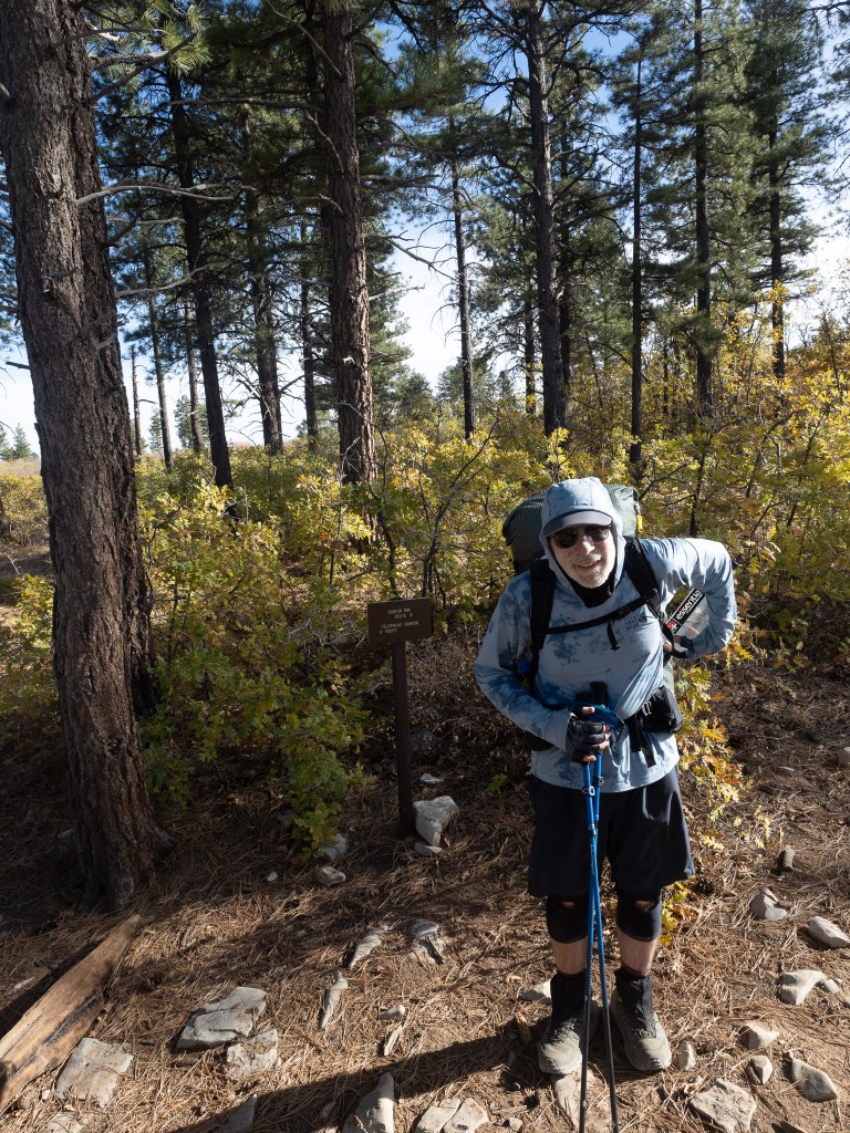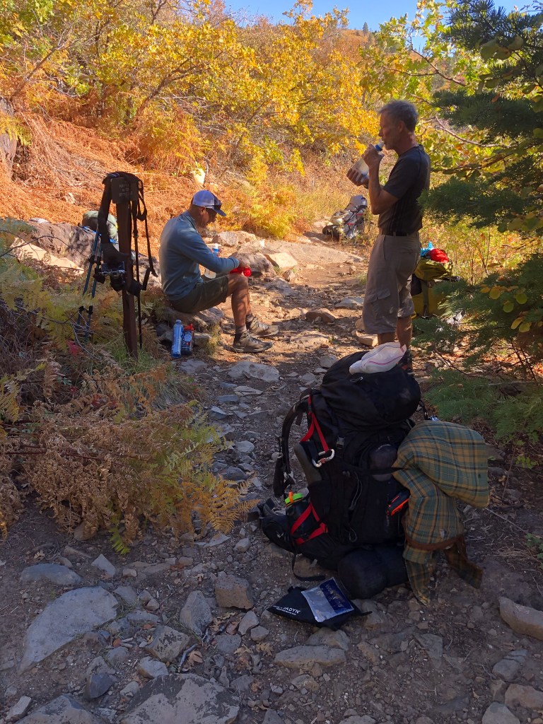 Beyond the spring, the Wildcat Canyon, which is cut by Blue Creek rises up to the level of the trail as it winds around towards the junction with The West Rim Trail offering up views to the south bordered on both sides by the fall colors of desiduous trees. Beyond the Blue Creek crossing, the trail ascends all the way to the trail junction where we found some shade, to rest within. We were just out of sight from the trail, and heard some voices, which we came to find belonged to 3 trail runners who were watering up using their water cache. They were running the Trans Zion Trek in a single day. 37 miles, and they still had about 13 to go. I am going to say they just finished the worst part, and though the last 14 were not easy, they were way over the hump. It wasn’t long before they caught up to and passed us after we had left them. I remember the same sense of awe from 2011 when a larger group passed us, also on the West Rim Trail, doing the same run and having started their run at 4am. These two would finish before sunset.