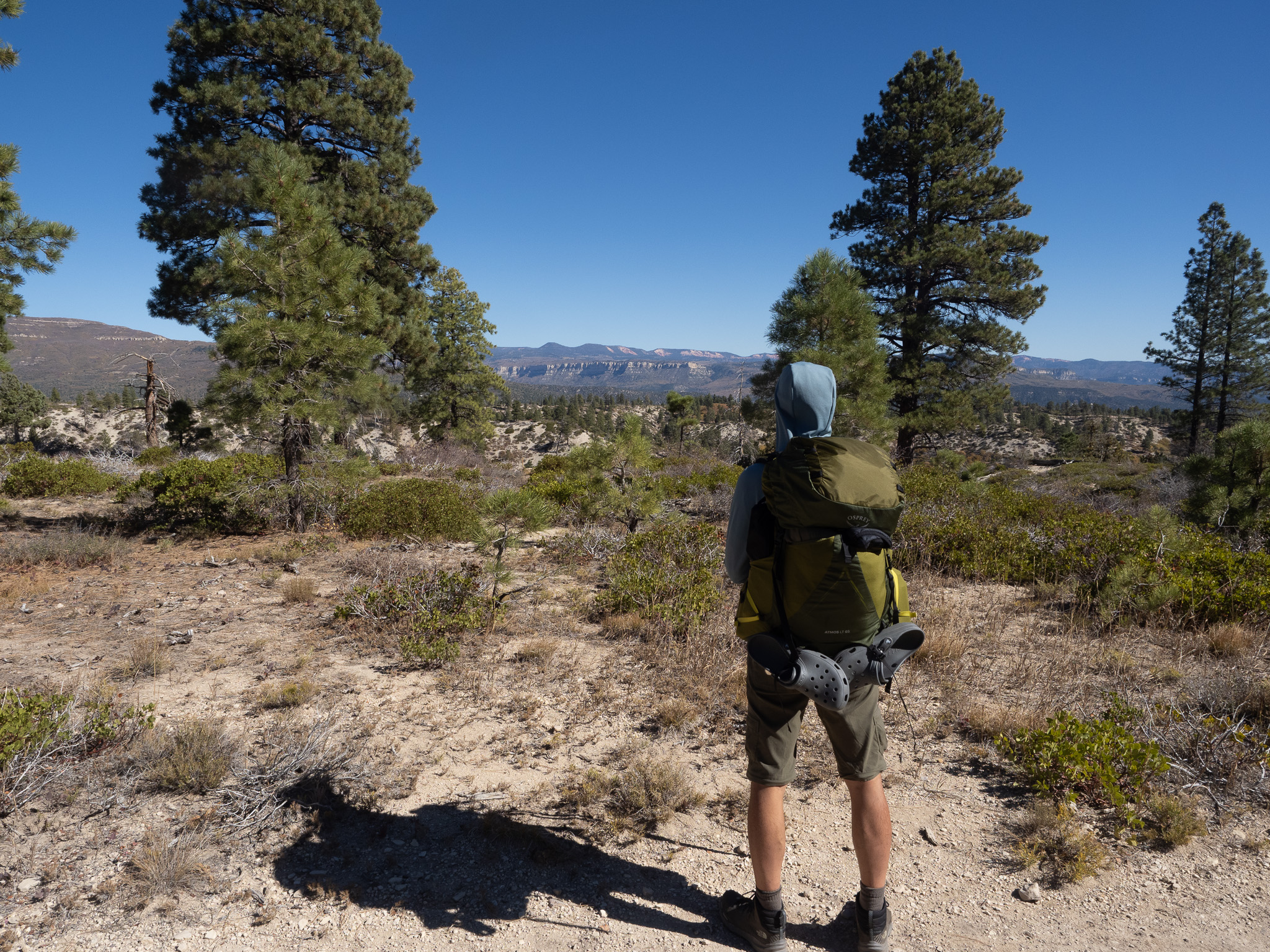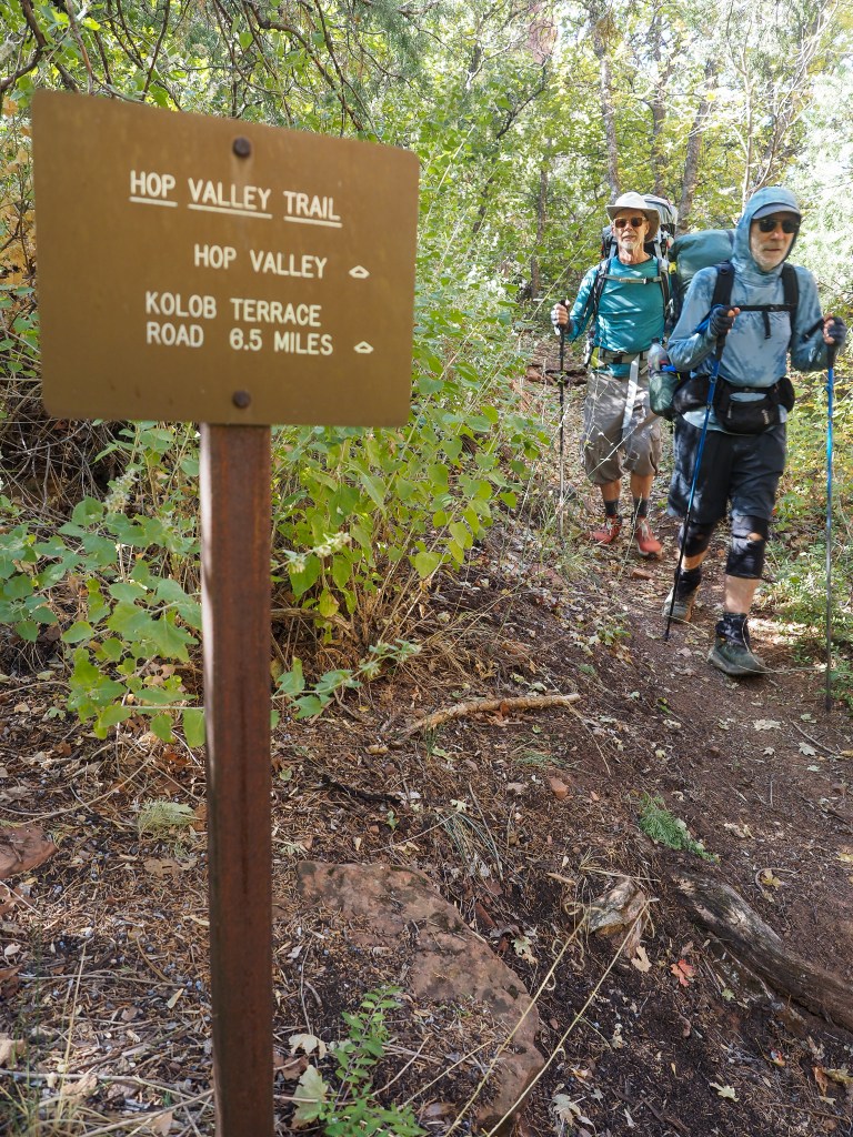 We had approved a first up, wake the others protocol, because we had a big day ahead. We had to hike the Hop Valley, and then climb out of it and onto the Kolob Terrace. That would be a flatish hike until the trailhead where Paul came in was reached, where we could take advantage of our water cache, and then onto the Connector trail, 4.1 miles of elevation gain until we join with the Wildcat Trail, and then at least 2 more miles until we reached the meadow that I remembered from 2011. That was what lay ahead as we breakfasted, coffee’d up, and packed. We all decided to carry about 2.5L of water to cover the 5 miles to the water cache, and we would use all that water too, but after we were all finished, we found that we had twice as much water as we needed still, so a little wasted work getting water the day before. Live and learn.