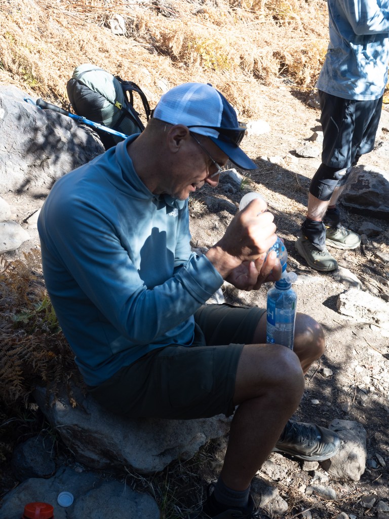 We did just that, and it worked out just fine. The water was cold, and delicious and we grabbed just enough for our needs through the next day, and retreated back to camp where I exclaimed that this must be one of the best sites in the entire National Park System, with it’s awesome East facing view, it’s proximity to water, and its flat level ground for tenting with giant Ponderosa Pines for shade. It was truly magical, and achieved a greater status as the setting sun cast the Eastern clouds (there weren’t many of them) a red glow that was beautiful. We took care of our dinner, and dessert needs, Jim and I sipped some whiskey, and then with our teeth cleaned we took care of food safety, and retired for a sunrise wakeup call the next morning. Death March 2 was over and everyone was hydrated, fed and happy.