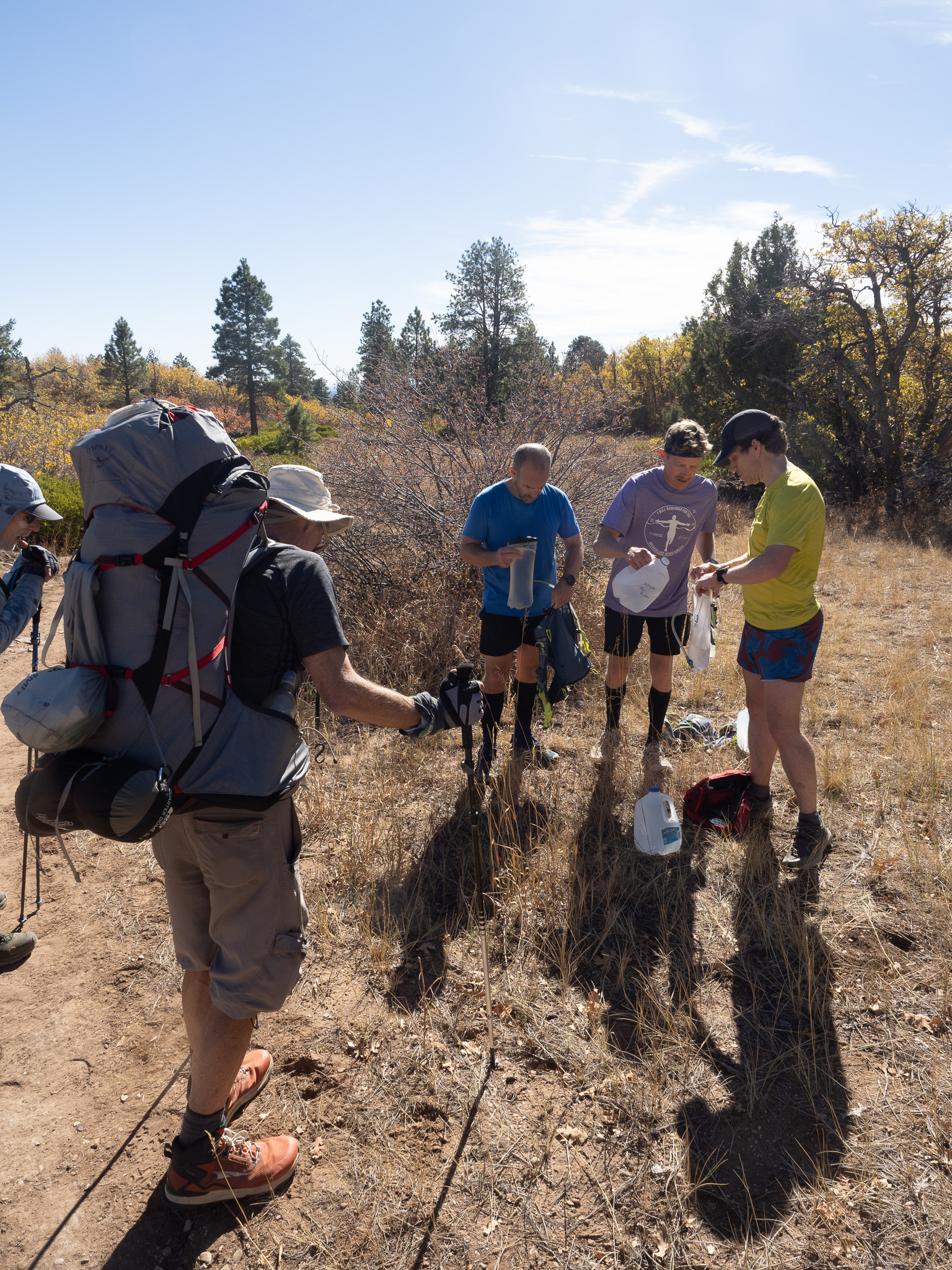 After dropping our packs, and setting up camp, we had a little snack, and then Jim, Jed and I left Mike alone, and went back for water. We grabbed every bottle, both 3 liter Katadyn filters, and my 6 liter dromedary, and walked back. As I write this I recall at first we were thinking we will get water when Paul arrived, but what I haven’t mentioned yet was I was getting messages from Paul. Luggage Checked! On the Plane! Then a long pause. Landed! Rental Car line is Slow. etc etc. The point here being that Paul was going to be lucky (loses an hour crossing from Nevada/Arizona into Utah), to be on the trail by 4 PM and knowing how easily distracted Paul becomes, he would not walk into camp until 630 earliest, so we had to get water without him. We set off at 4, and the last message from Paul was he thought he would be on trail at 420. With light packs the walk back was fairly easy, and of course by the time we got to the switchbacks, the light had changed significantly, so there were new photo opportunities. That image above was taken during the water trek. We zoomed down the switchbacks, and then spent at least 45 minutes filling our various Katadyn bags, and gravity filtering into our empty bottles and dromedary. Including the two 3L Katadyn bags we filtered about 22 Liters of water. I carried 10 or 11, and Jed and Jim split the rest. Now, if you remember your chemistry class where you used the metric system you may recall that 1 mililiter of water equals exactly 1 gram of water. So, 10 or 11 liters is 10 or 11 kilograms, which is about 24 pounds, so I was very glad that we decided to do it this way, because hauling that water back up the switchbacks was a chore.