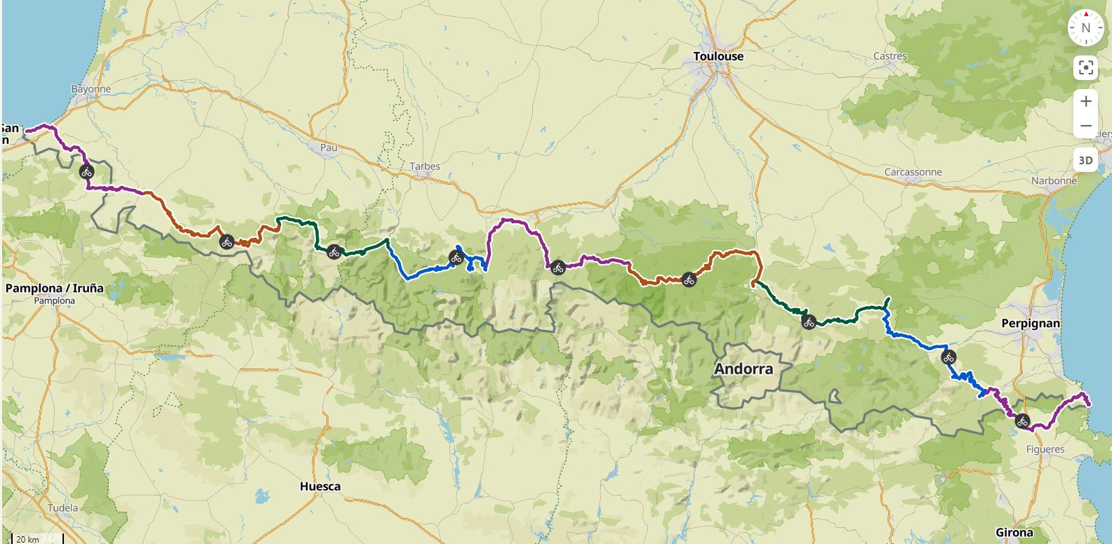 As a refresher, this is the route which basically is a route engineered by Peter Cousins, a travel cyclist writer who spent many many hours on bikes in the Pyrenees writing about all the special places, in all the regions spanned, and then combined them all into 1 end to end ride that could be broken up into as many days as the rider wants.